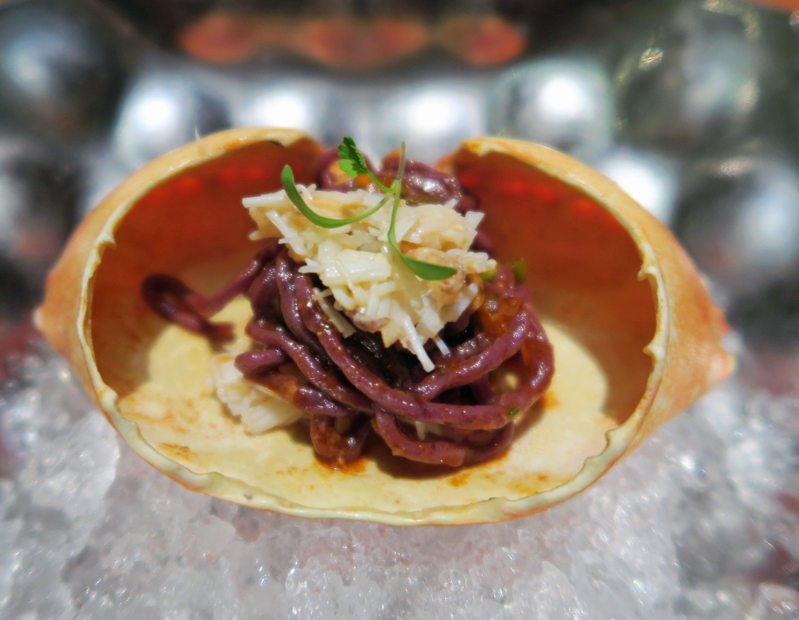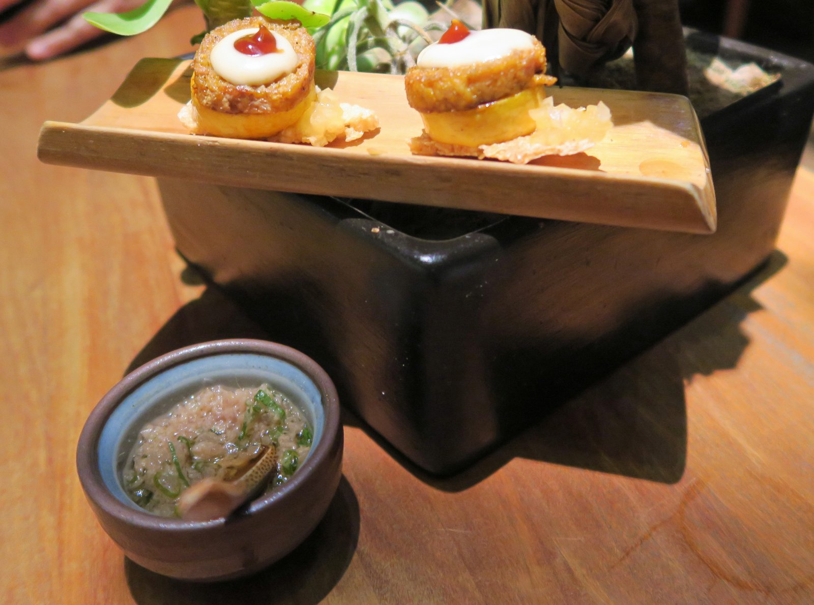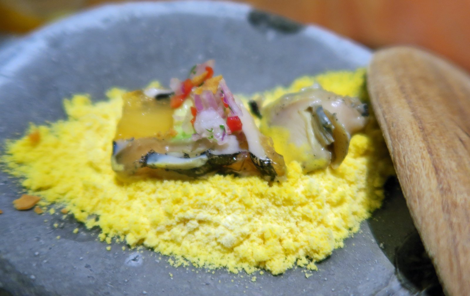 The next dish was simply called "Churos"….no not churros, but churos, an Amazonian land snail. The snail had been simmered in a soy based broth, with perhaps some sake and mirin. It was enrobed with a very tasty foam made of dale dale root, which I believe is a type of arrowroot and garnished with "chalaca", a basic topping made of corn, tomato, and onion.