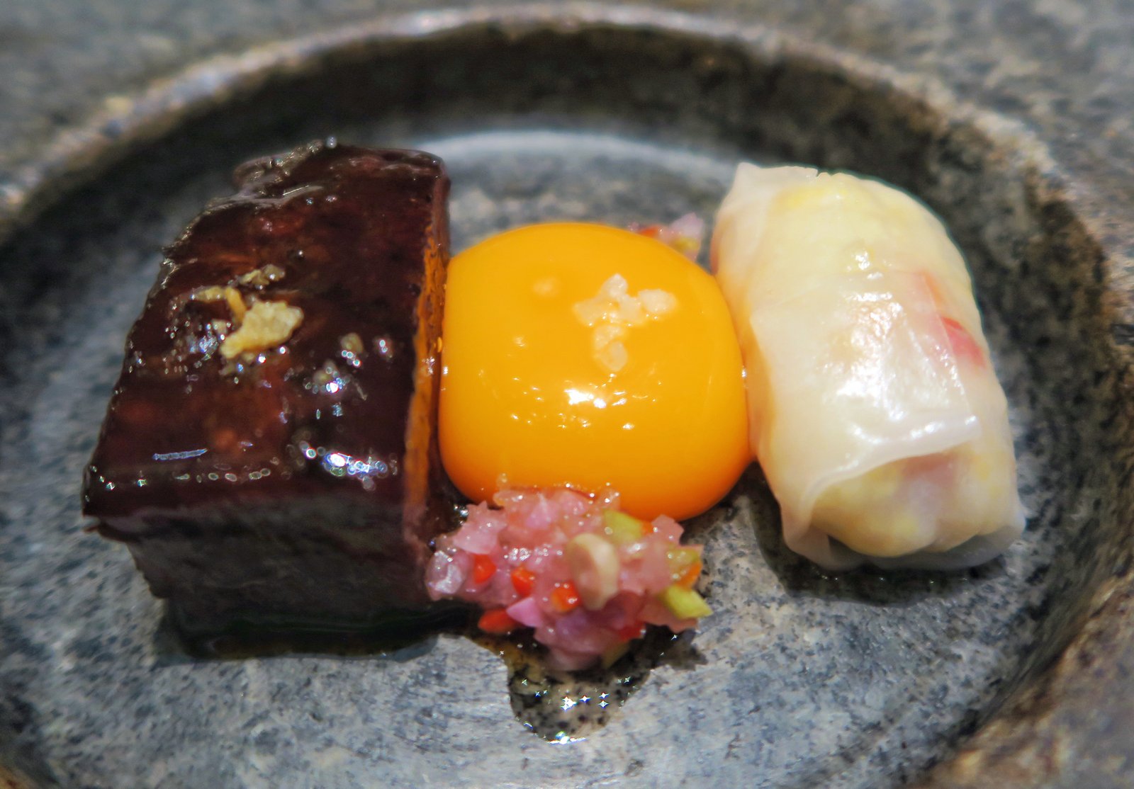 The A lo Pobre, a wonderfully beefy piece of meat torched, then topped with a quail egg. As a bonus, the quail egg had been injected with ponzu sauce, which added the nice salty-acid component which meant all the difference to this piece of nigiri. The mollejas (beef sweetbread) was nice and fatty which aided the texture, but this was a bit too tame in flavor compared to other piece.