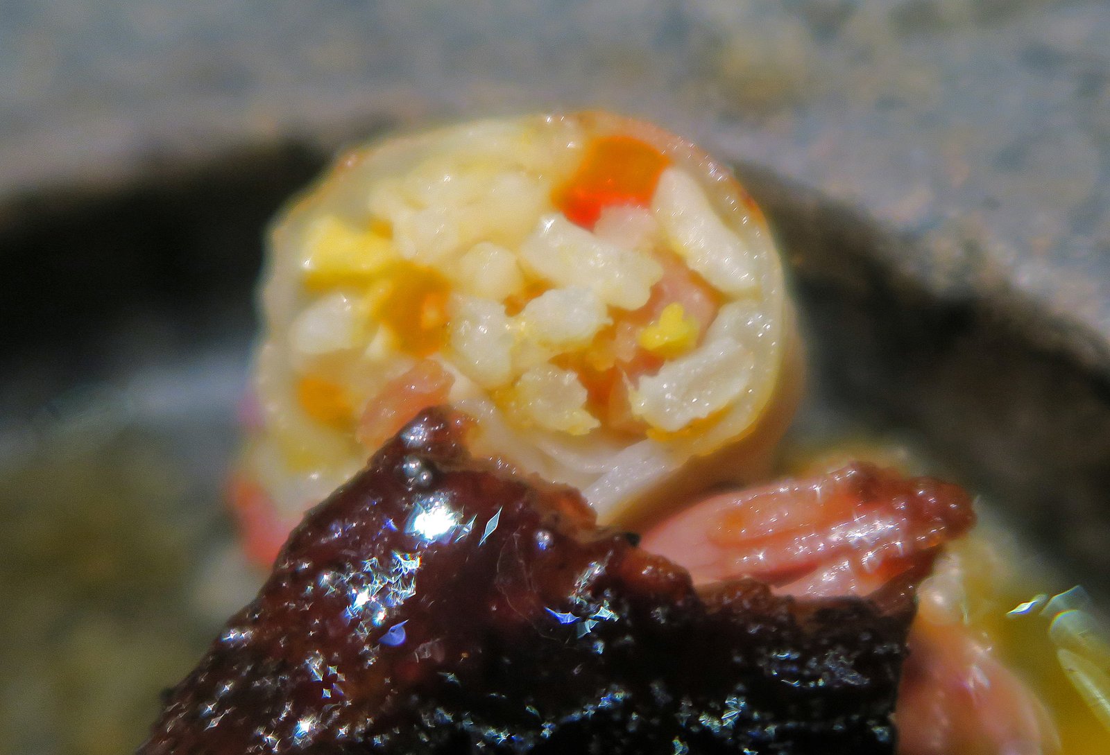 The flavor and texture of the Wagyu Shortrib, which they said was cooked for 50 hours…..I'm pretty sure via sousvide, was amazingly tender and the flavor was a nice balance of salty to sweet…..and the egg yolk just added more richness (as if it were needed) to the dish. We both found the Cecina (cured pork) fried rice wrapped up like a spring roll to be kind of odd as it was on the mild side in regards to flavor.