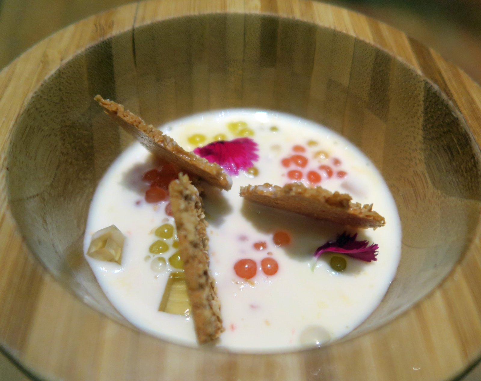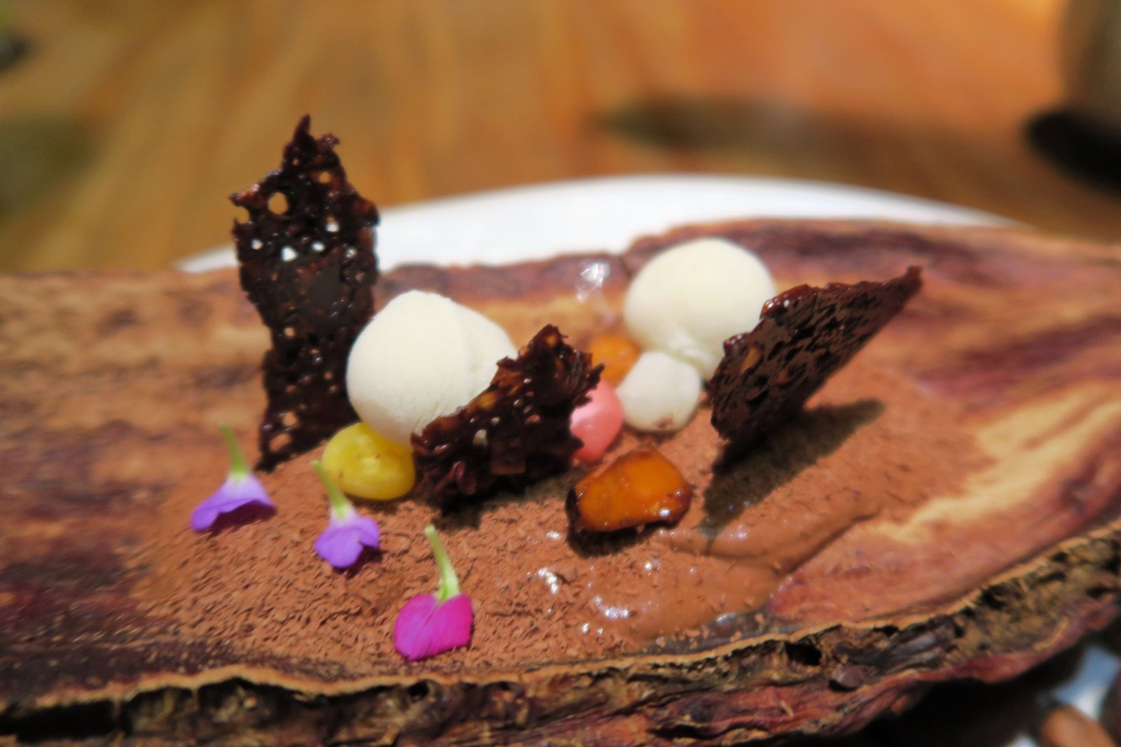The other part of the dish were sausages, which seemed like a cross between a bratwurst and chorizo, layered on plantain, senbei (no kidding – senbei) with a sachatomate (tamarillo) emulsion. Nice, but nothing to really get excited about.