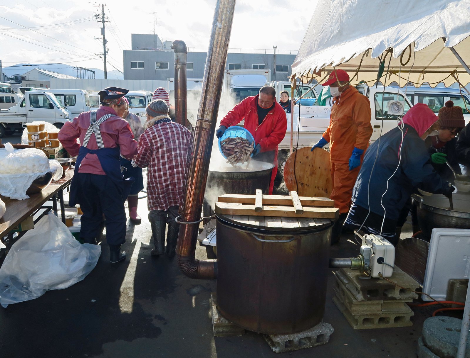 And noticed the gentleman dumping baskets of mantis shrimp into a cauldron.