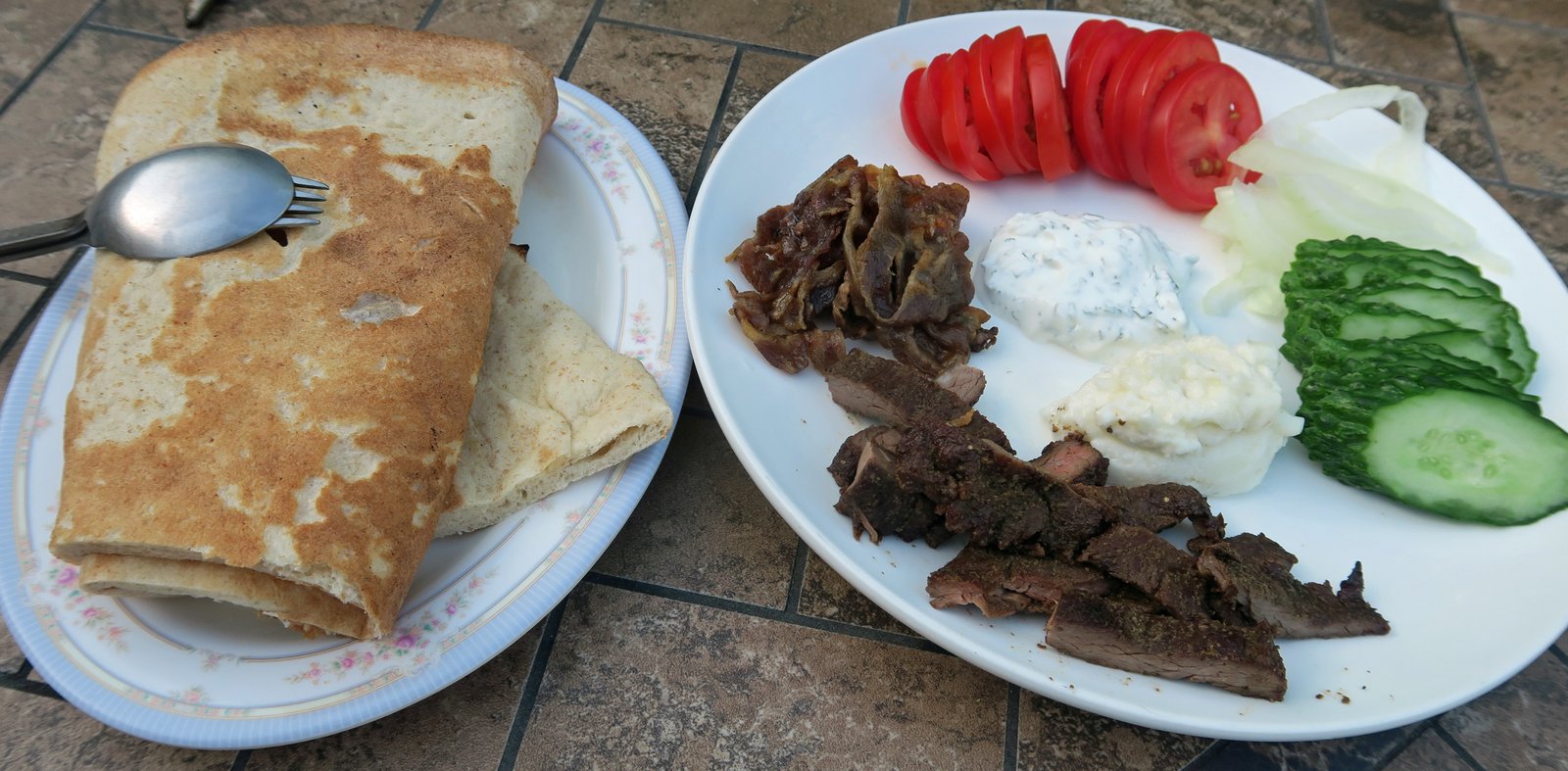 Beef Flap is back on the menu in the household. I grilled up a bunch along with other veggies and meat to last the Missus most of the week. This time I did the Cumin and Sichuan Peppercorn thing. The next day, I picked up some garlic paste and flat bread on the way home. We had cucumbers from the garden, some Roma tomatoes, and Vidalia onion. And I mixed some Labneh with mint and a touch of lemon juice. I also had some thinly sliced Berkshire Pork basted with garlic olive oil. Talk about a quick and satisfying dinner.