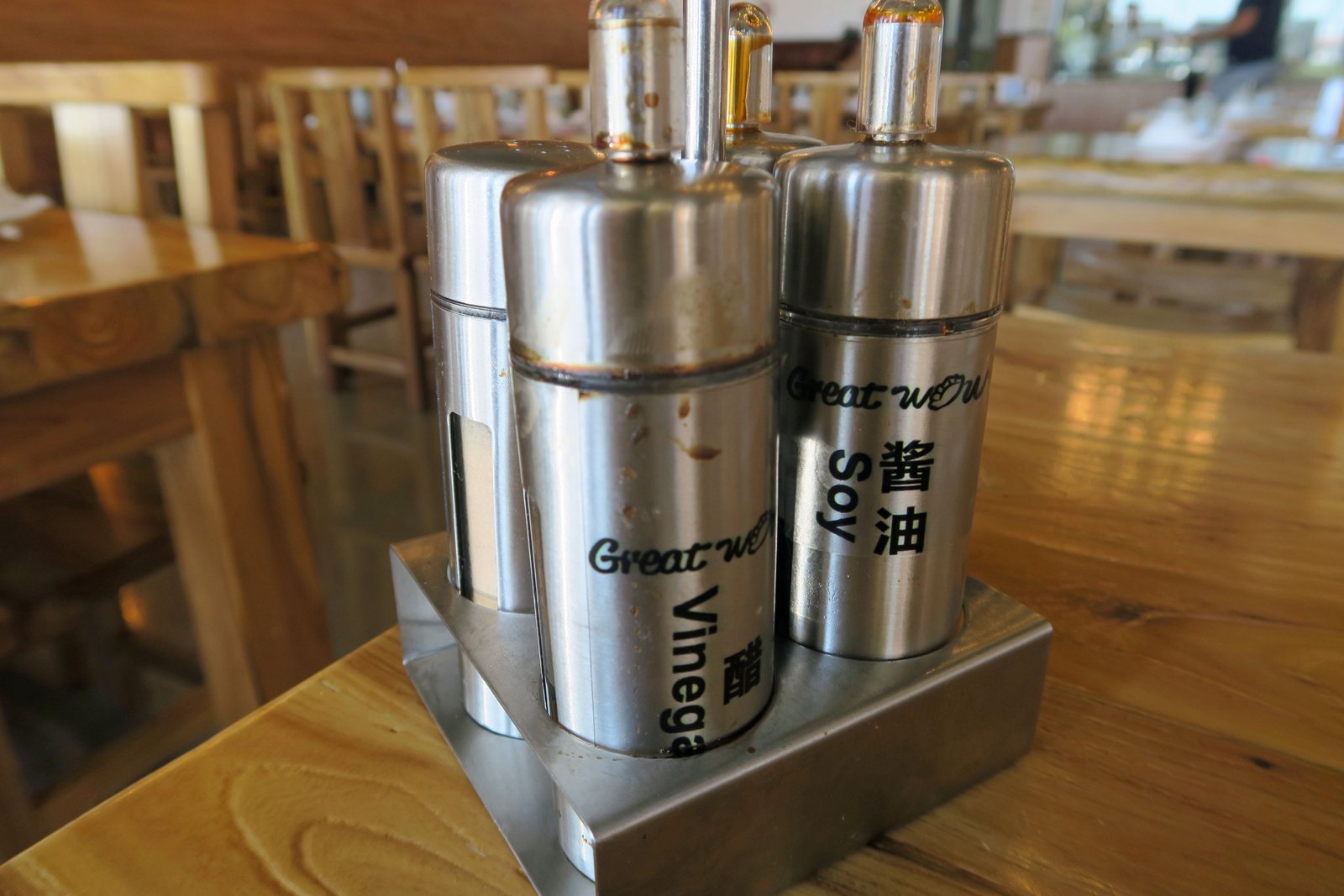 I placed my order and sat back. Remember how rather tattered the menu looks? Well, check out the soy sauce and vinegar dispensers? Only open a week or two and the place already looks like it's in the SGV……are sticky tables around the corner?