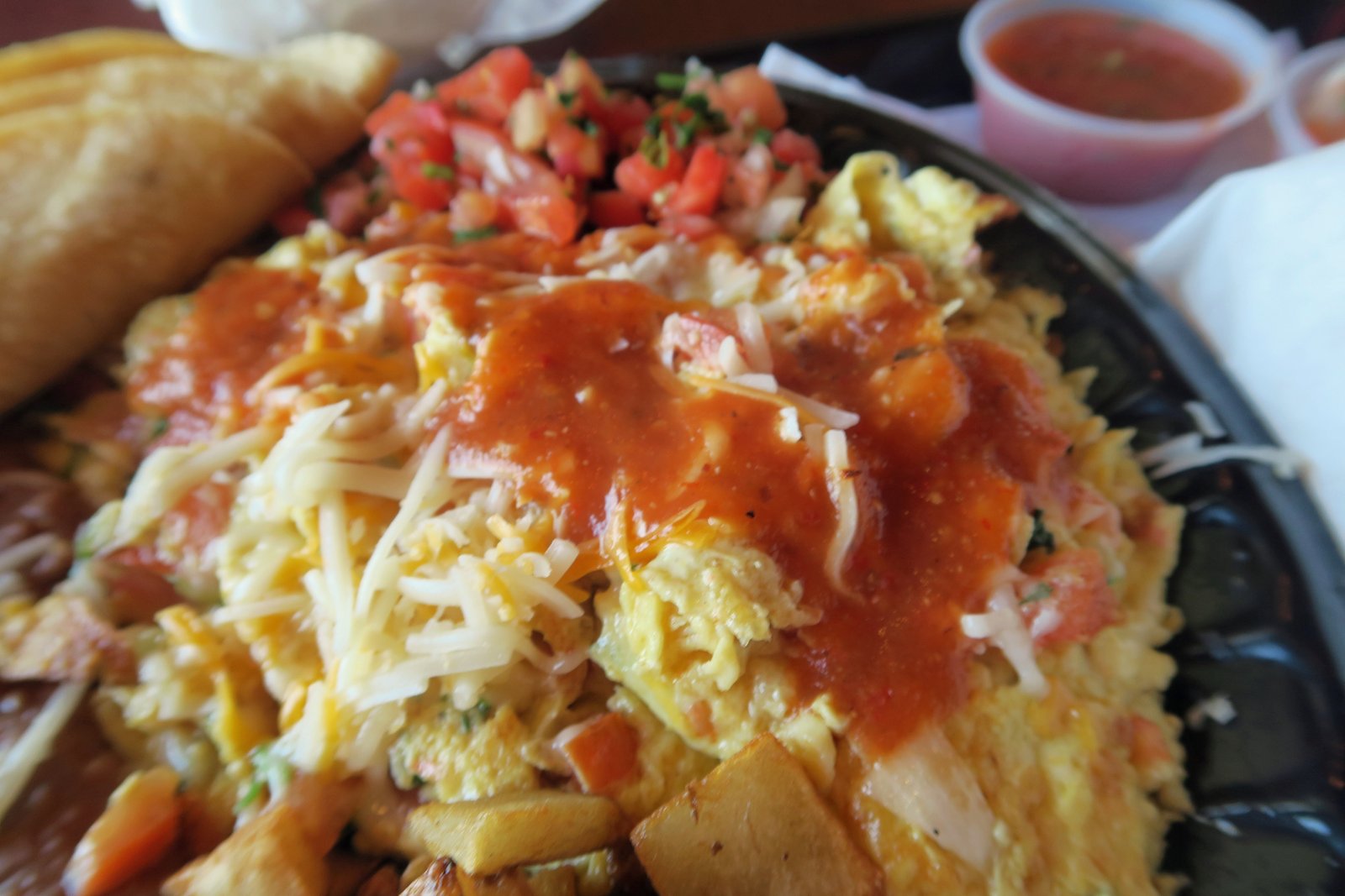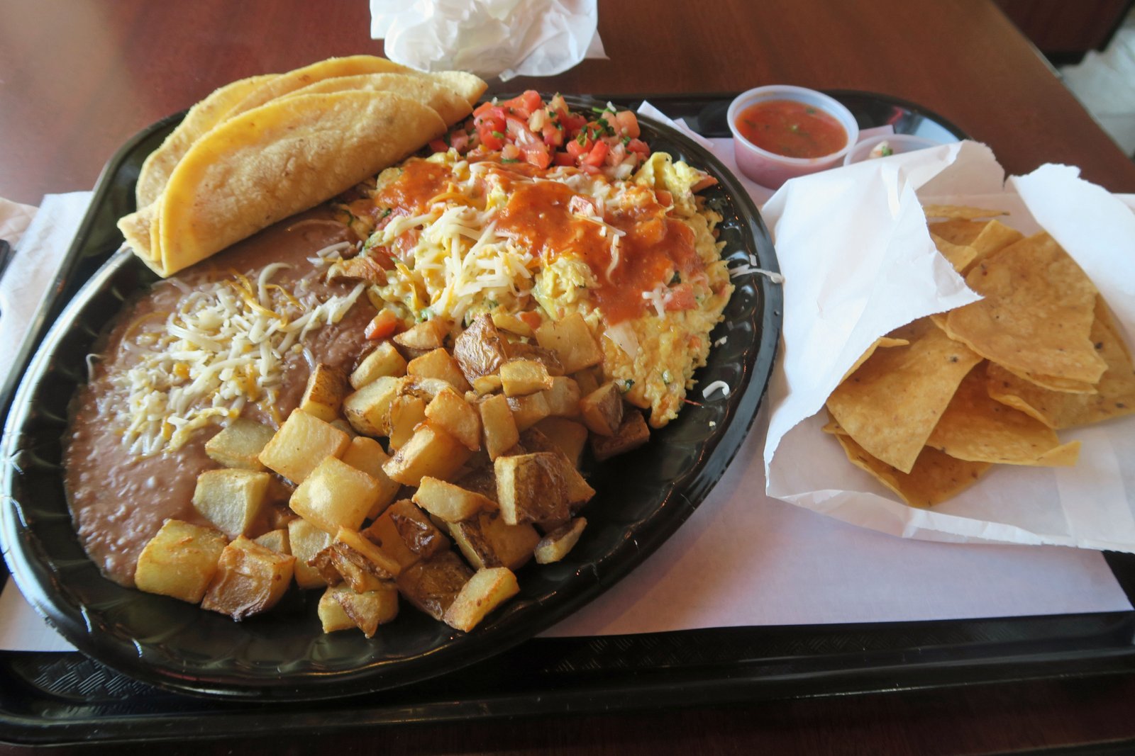 El Portal Rev 02  El Portal Rev 03Eggs scrambled with peppers, onions, and tomato…topped with cheese. Potatoes from the fryer, a load of fairly salty beans, and tortillas. The coup de grace….a bag of chips. I covered things in pico de gallo and could not finish this. Nothing fancy, nothing amazing….but if you're looking to eat nothing until dinner this might do.