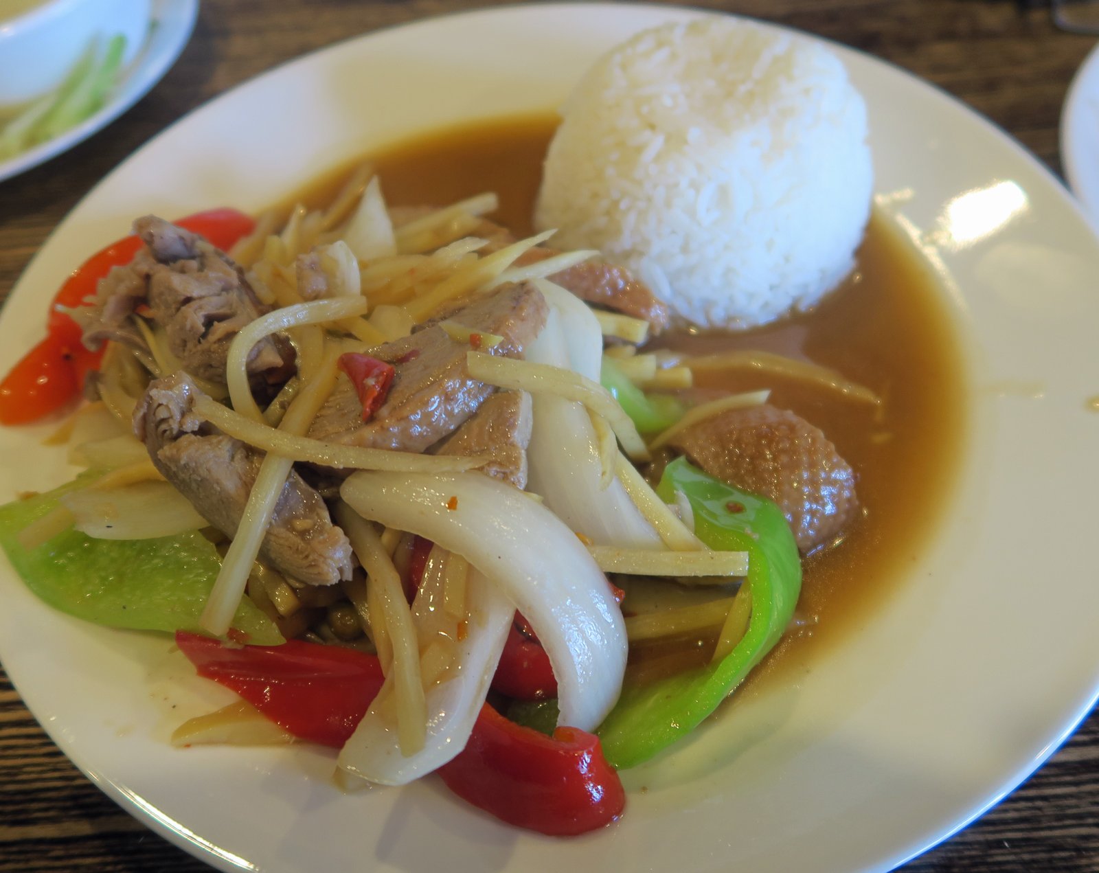 It looked like this wasn't even stir-fried; there was no color; the duck a sad grey, the veggies almost raw….did they put this in a microwave? It was, other than having a small stash of Thai Chilies hiding at the bottom of this fairly bland. The rubbery duck had a bit of flavor; but this wasn't quite what I signed up for.