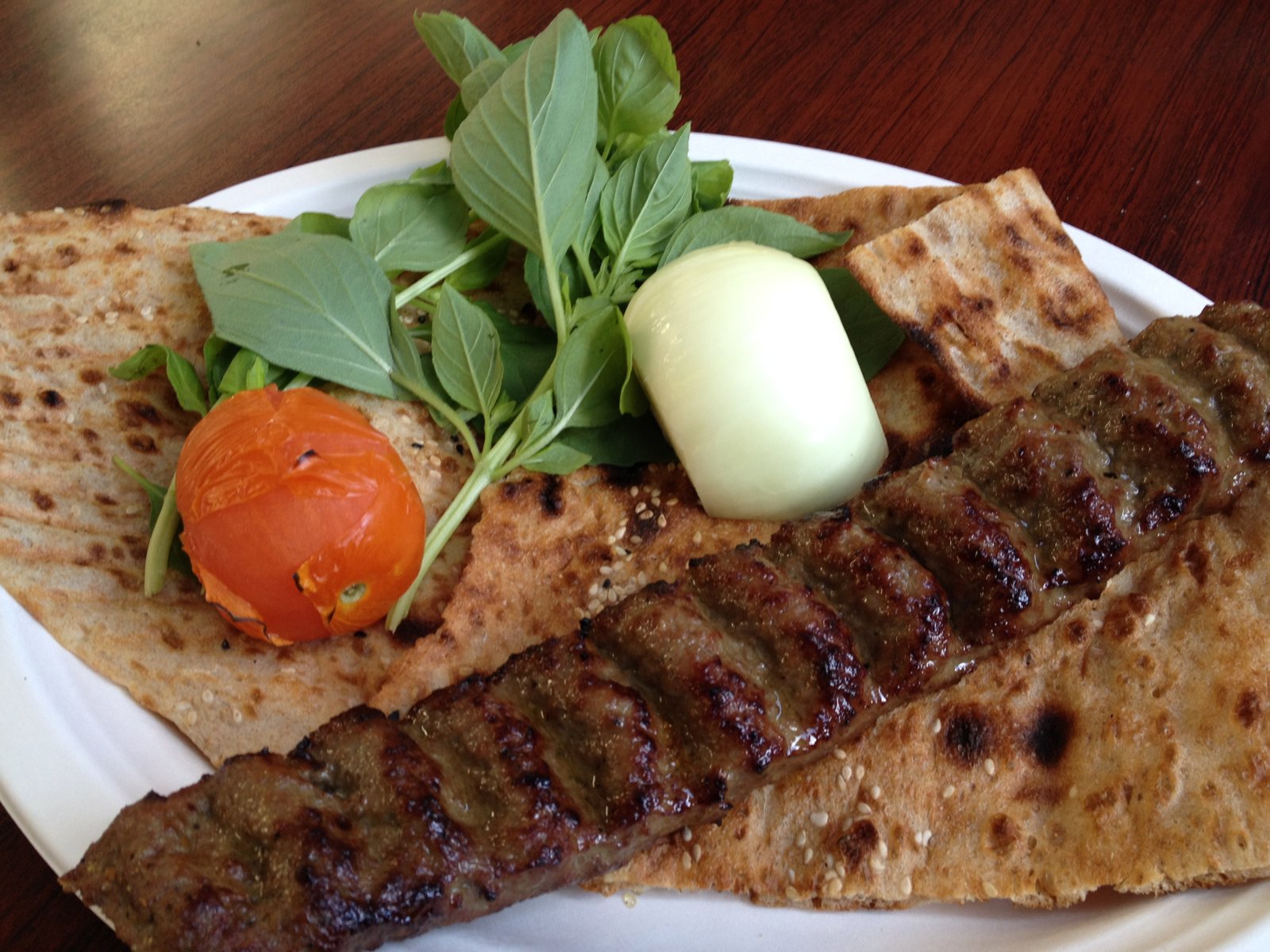 The a la carte kabob plate is $4. This is a seasoned ground beef (koobideh) kabob served on top of store baked flatbread, with the onion, grilled tomato and basil; quite enough food.