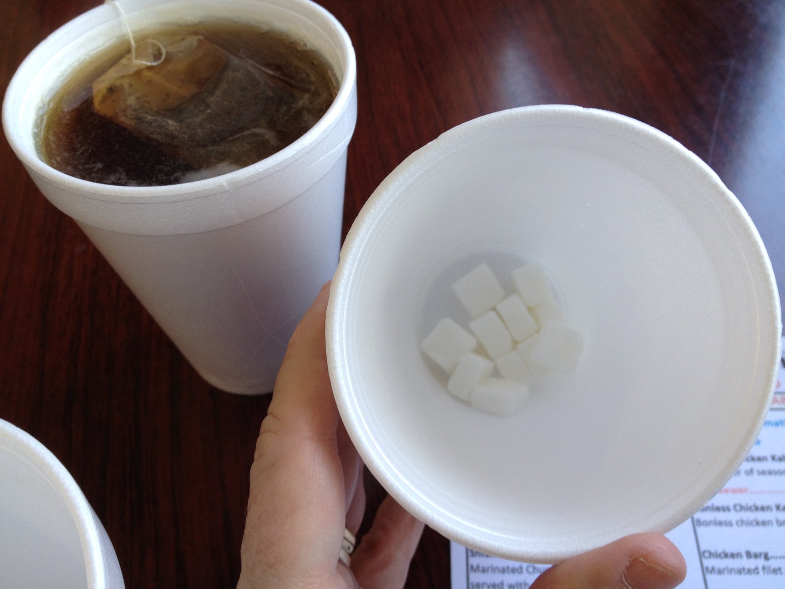 For $1 you can get a cup of tea, which comes with tiny sugar cubes.