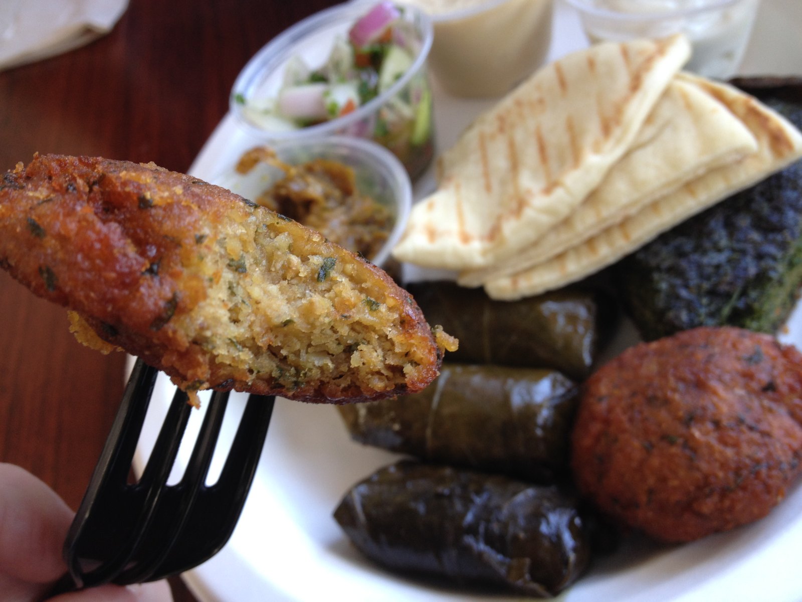 The vegetarian meza is $9 and includes dolma, fresh made falafel, a slice of Kuku (spinach/egg/spiced pie), eggplant salad, cucumber salad, tzatziki, hummus and pita bread.