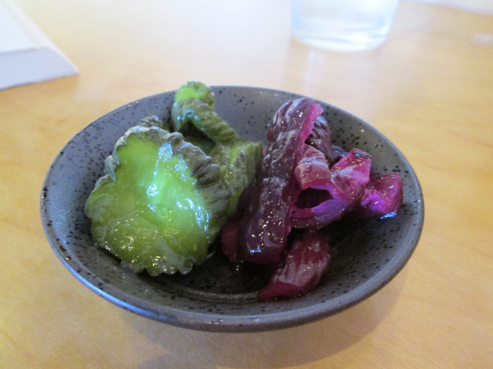 The tuna was surprisingly good, and the other three were all decent. As ordinary as this lunch was, Yuma has no place I can count on getting sashimi that I will like, so I was happy. The lunch came with okay miso soup, rice, and these excellent pickles: