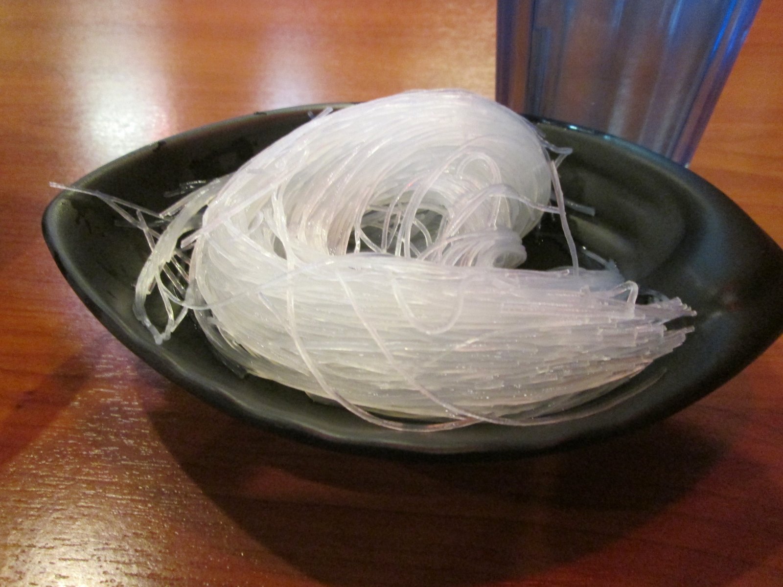 Since I had ordered the seafood hotplate with noodles instead of rice, dry cellophane noodles arrived first, and I was told to let them cook for a couple minutes in the hot pot: