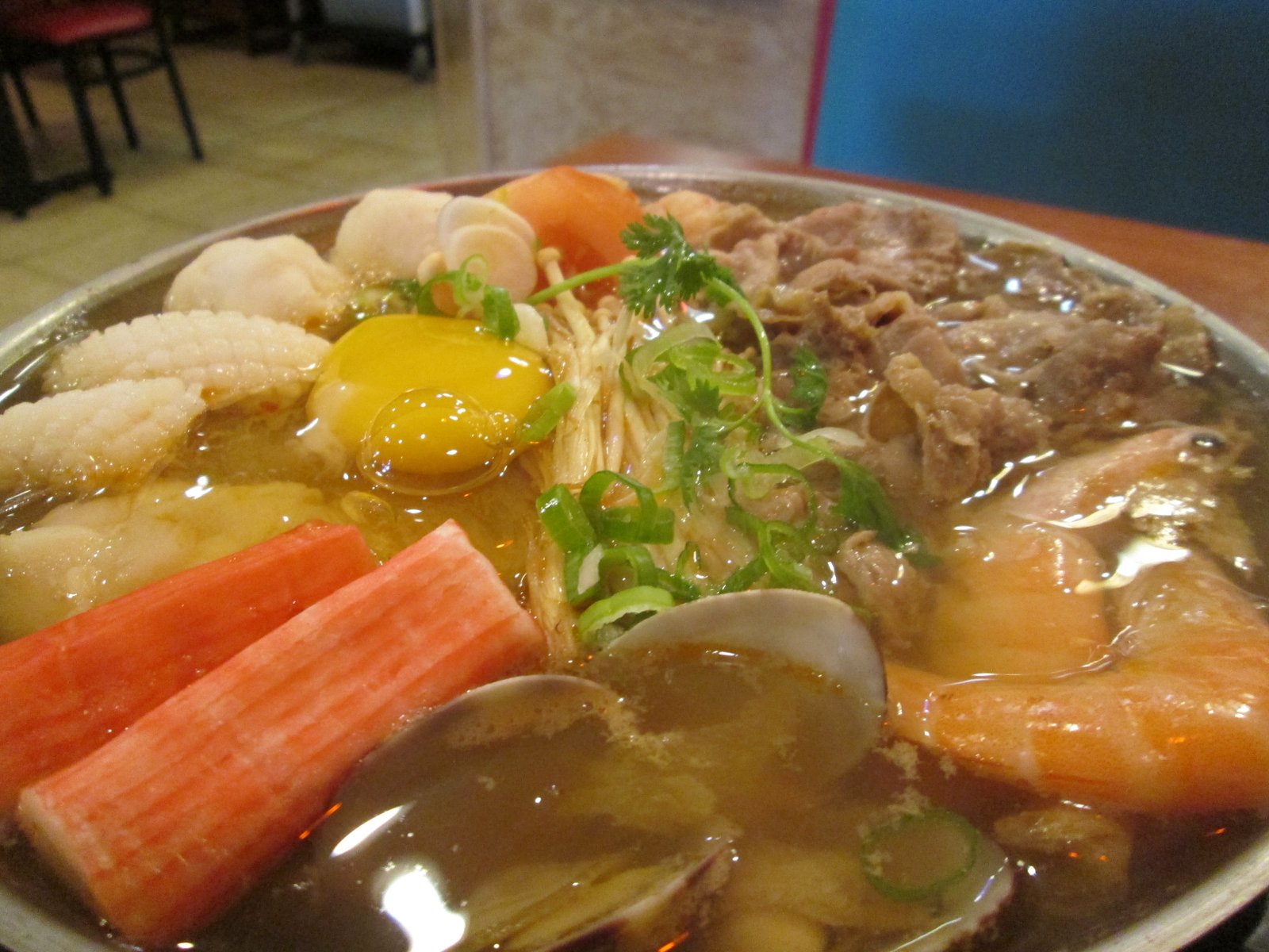 Overall I loved it. The broth was rich and flavorful and improved as the items cooked. I was a little surprised by the beef in a seafood hot pot, but the meat added flavor and tasted good. I liked the fish balls and shrimp balls, and I've quit complaining about krab in a reasonably priced meal. The two or three little clams were okay as were the two pieces of squid. Only the shrimp, which had a mushy texture, disappointed. I would certainly return and would love to try some different hot pots.