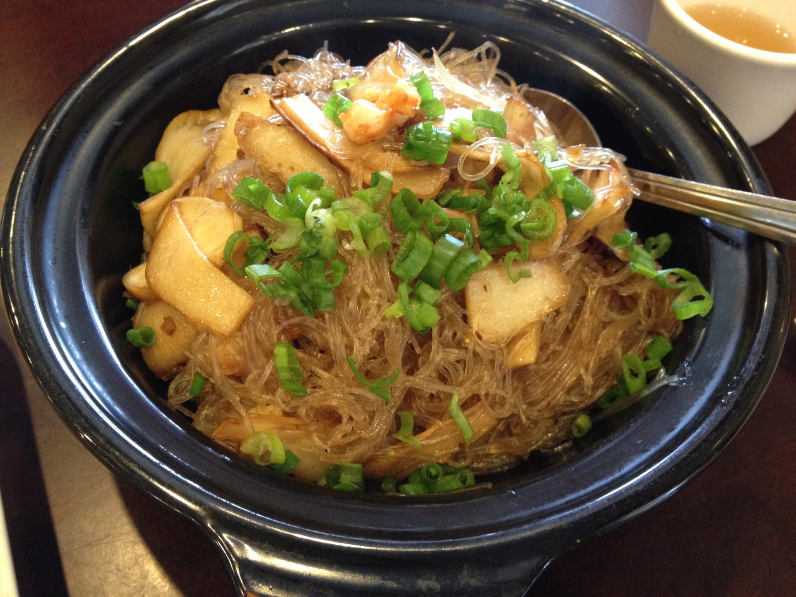 To accompany the plate of turmeric yumminess, I chose the oyster mushroom with shrimp noodles, which is tasty on its own but neutral enough to have as the 'side' (instead of rice). The bottom of the pot holds a buttery garlic surprise of chopped shrimp and some dried shrimp.