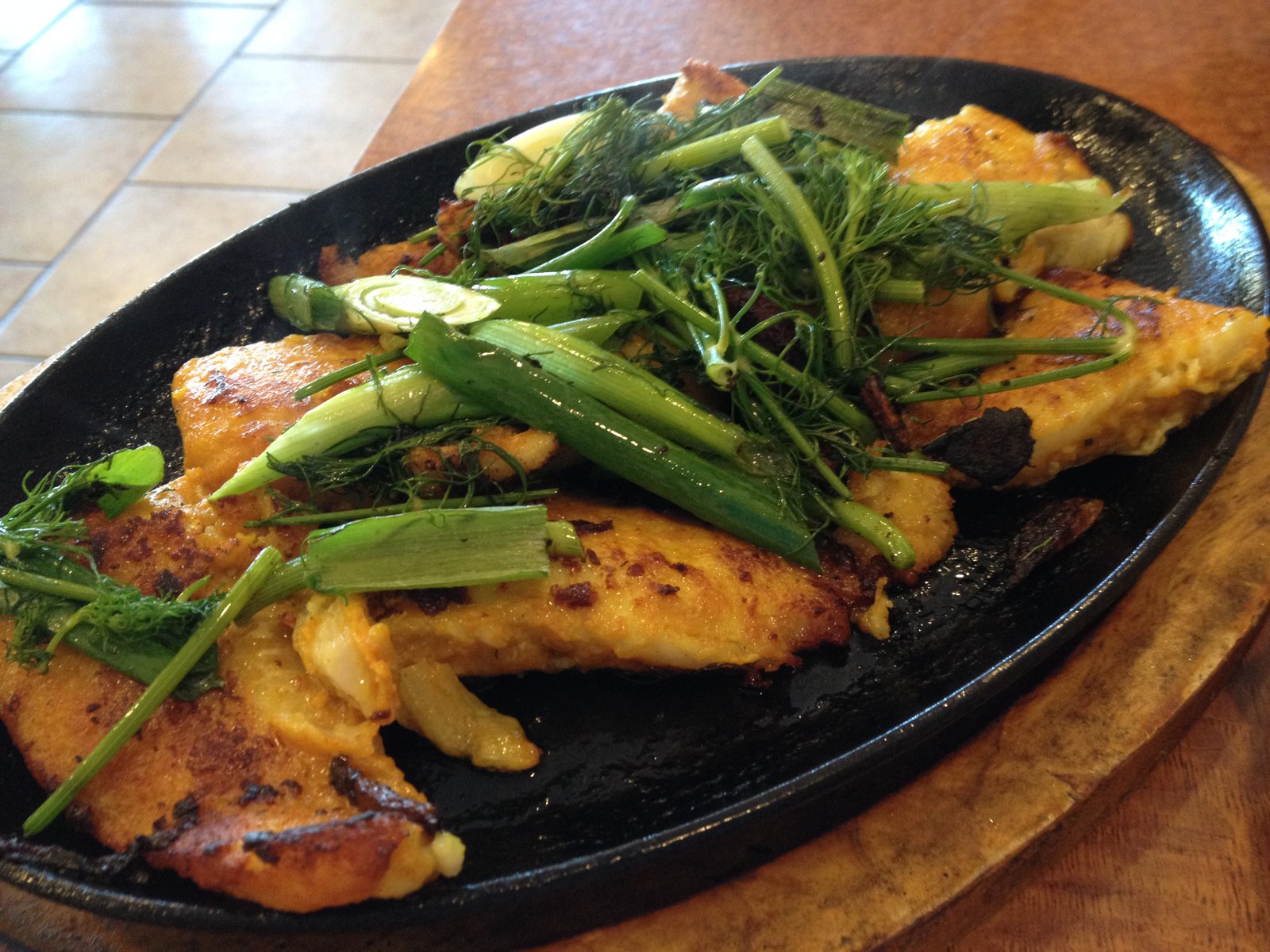 Immediately I knew what I wanted. The turmeric fish-Vietnamese style! (cha ca thang long)The fish is coated in flour, turmeric and egg then pan fried with dill and green onion. It's served sizzling on a cast iron platter.