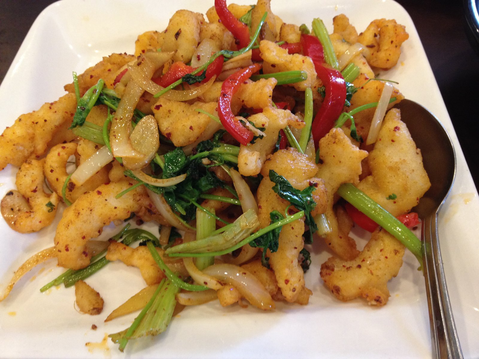 The cumin/flour/hot pepper coated fish, stir fried until the coating is crisp and topped with stir fried onion, Chinese celery and bell pepper. The numbing shows up at the end while the flavors of the fish and vegetables all come through at first.
