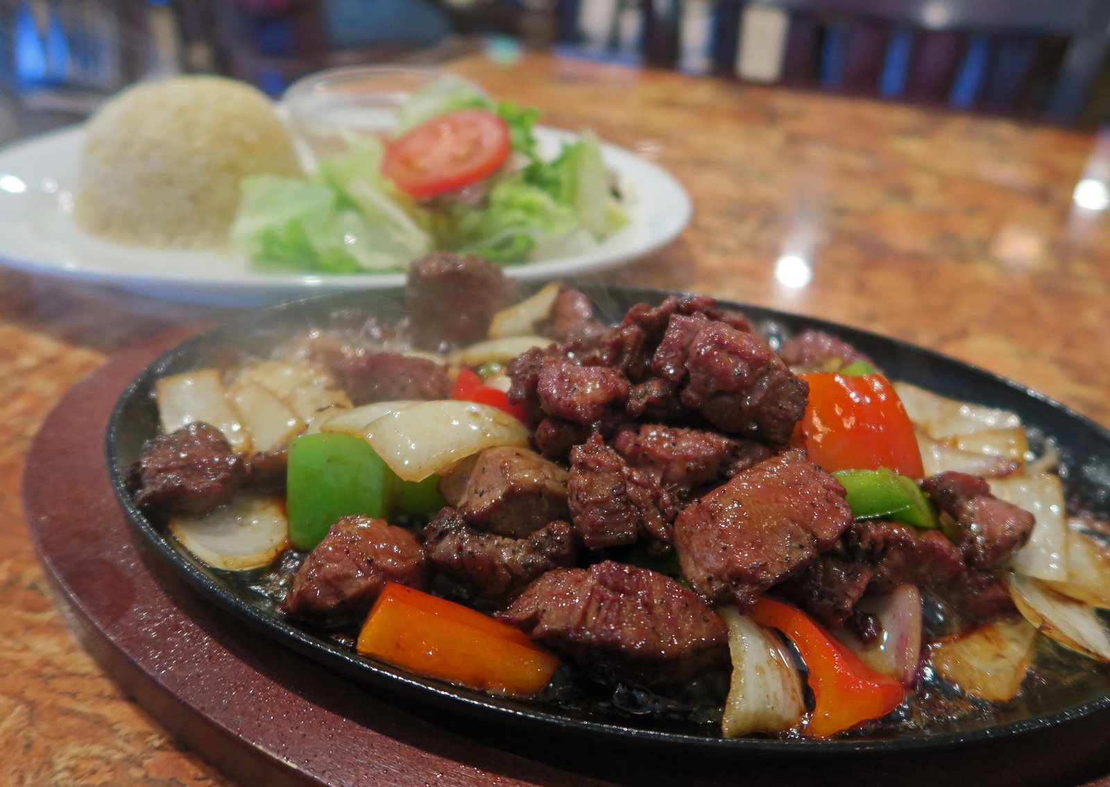 So these were deep fried, then topped with stir fried onions and peppers to give it some umph. These were fairly small wings; which doesn't bother me because I'm more about the ratio of skin to meat. However, half of the wings were slightly burnt, making the exterior bitter, not good eats. Also, these were overcooked and rather dry. The flavor of the wings, the parts that weren't charred, was fairly bland, which explains the need for the "topping". Not my favorite rendition of chicken wings to be sure.