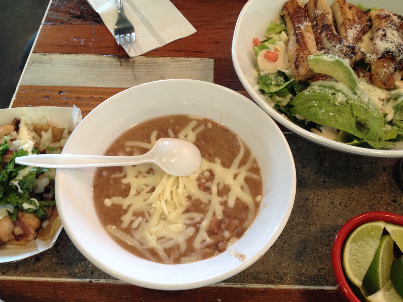 The grilled fish salad ($9) here is quite large and filling. The mildly seasoned and grilled fish is on top of a good size bowl of Romaine and has a Caesar-like dressing, about 1/3 avocado and basic salsa (chopped tomato, onion and cilantro) as topping. Since we also ordered tacos with this, we decided to share a side of refried beans ($2.50), which were surprisingly good. Unless you are ordering a plate, no items here come with refried beans (unlike at other taco shops, with beans and other items mixed in the burritos) and these were a really nice addition.