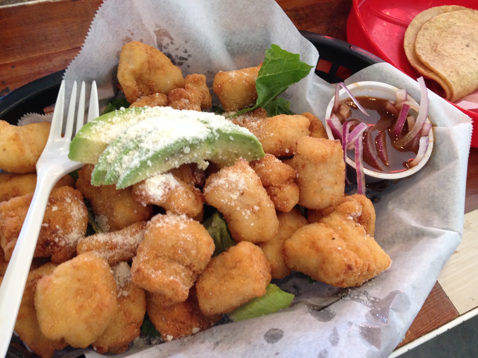 Simple, fresh, beer battered and crispy fried ($1.50/each) fish tacos are what started this business. Always good and quite large.