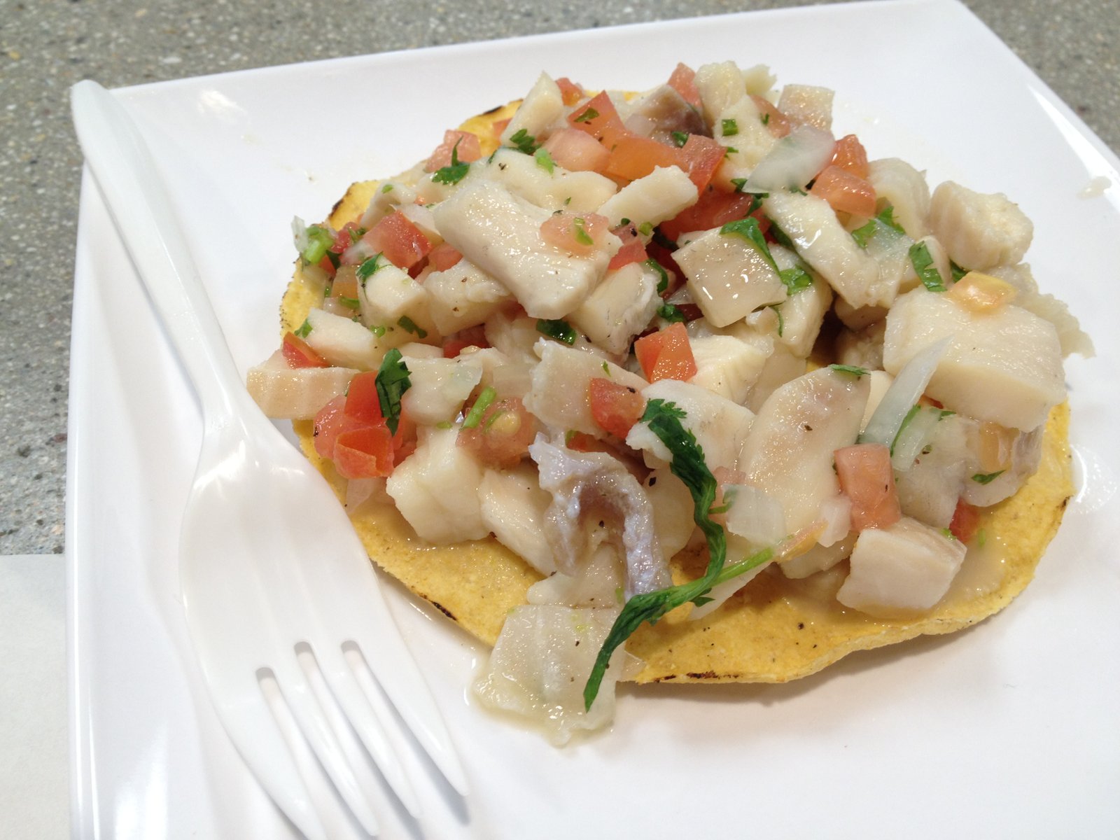 The fish ceviche tostada ($4) is quite satisfying, marinated in lime juice and mixed with the basics of tomato/onion/cilantro, it needs no additional condiments.