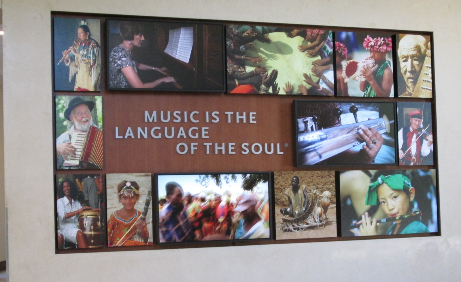 In the Main Lobby, a large display features the motto of the Museum, pictures of people making music, and screens showing music making in action: