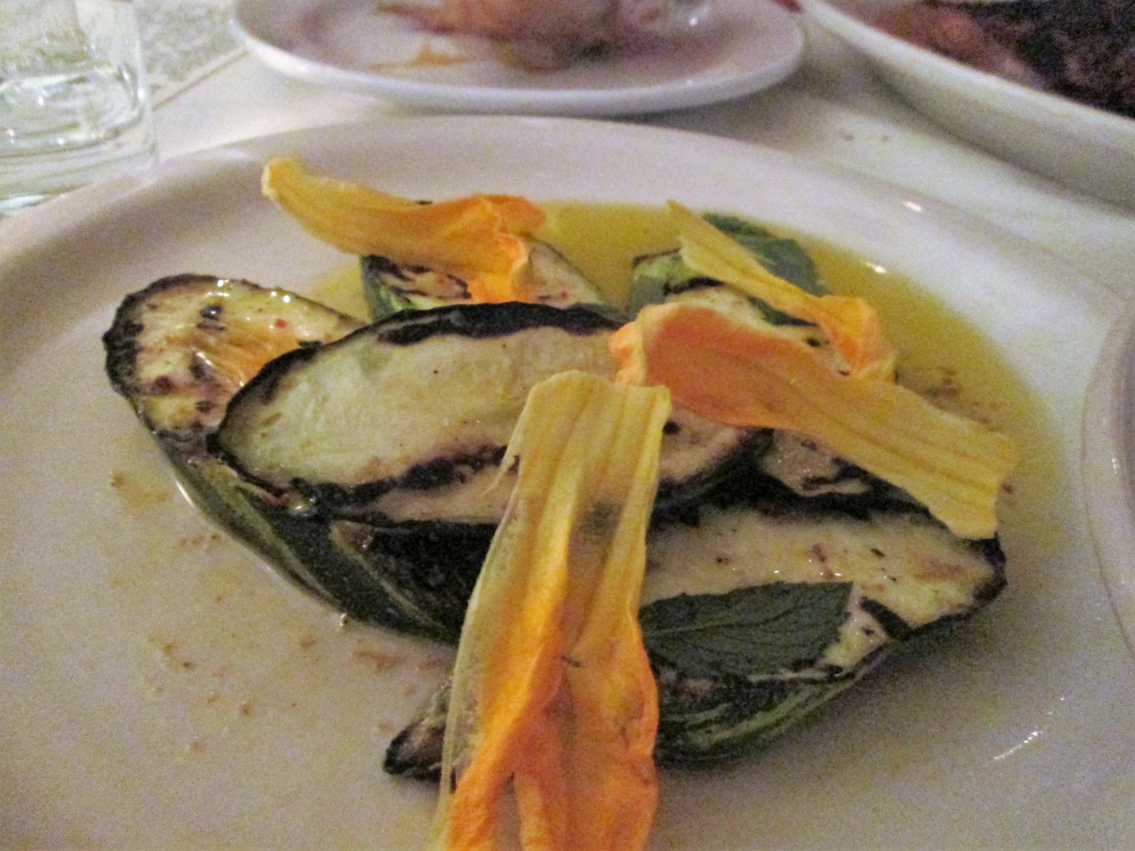 As a side dish we had large slices of zucchini – again showing the effects of the oven – served with squash blossoms and mint: