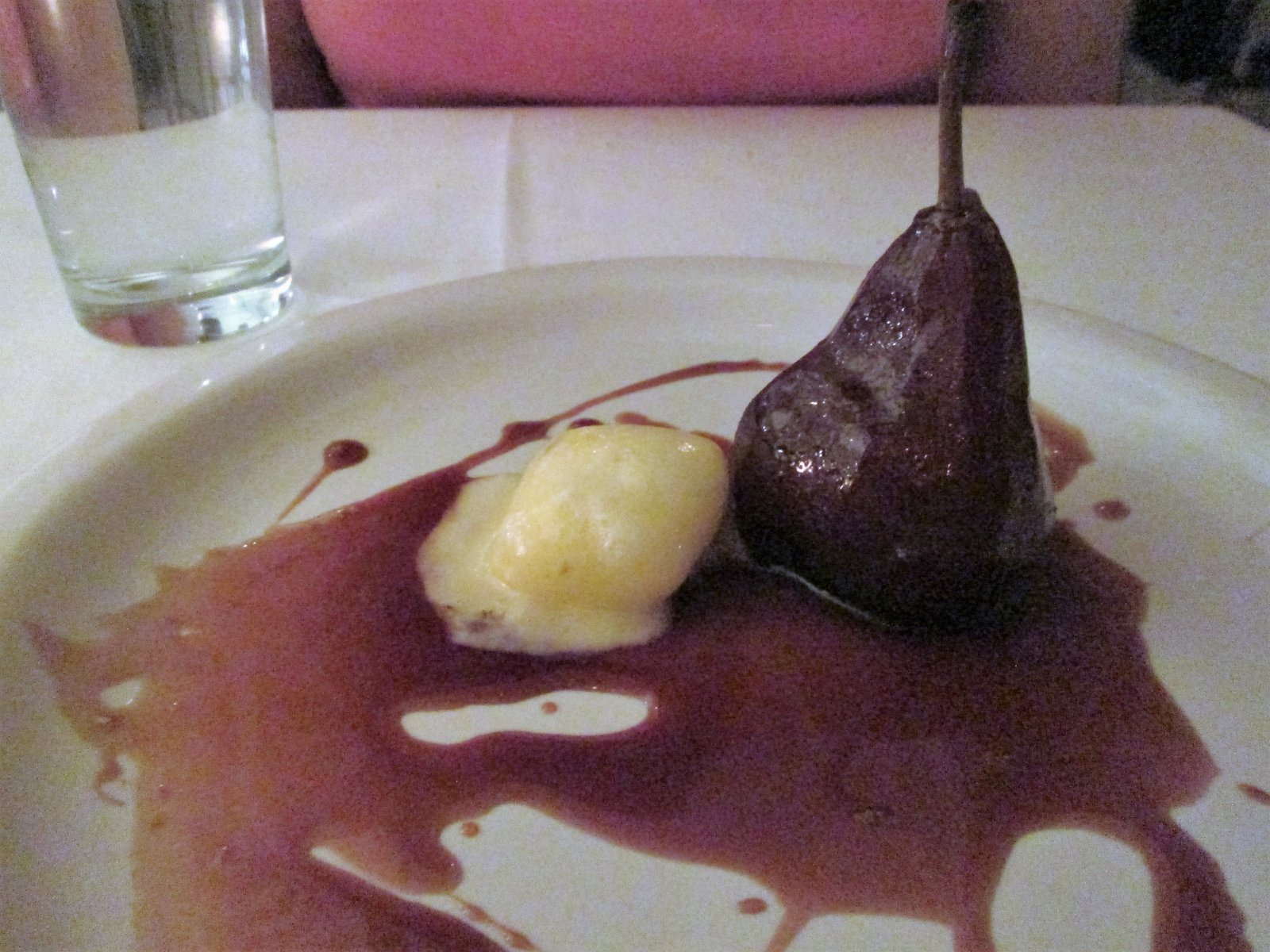 The dinner concluded with a pear poached in port with a small scoop of Gorgonzola on the side: