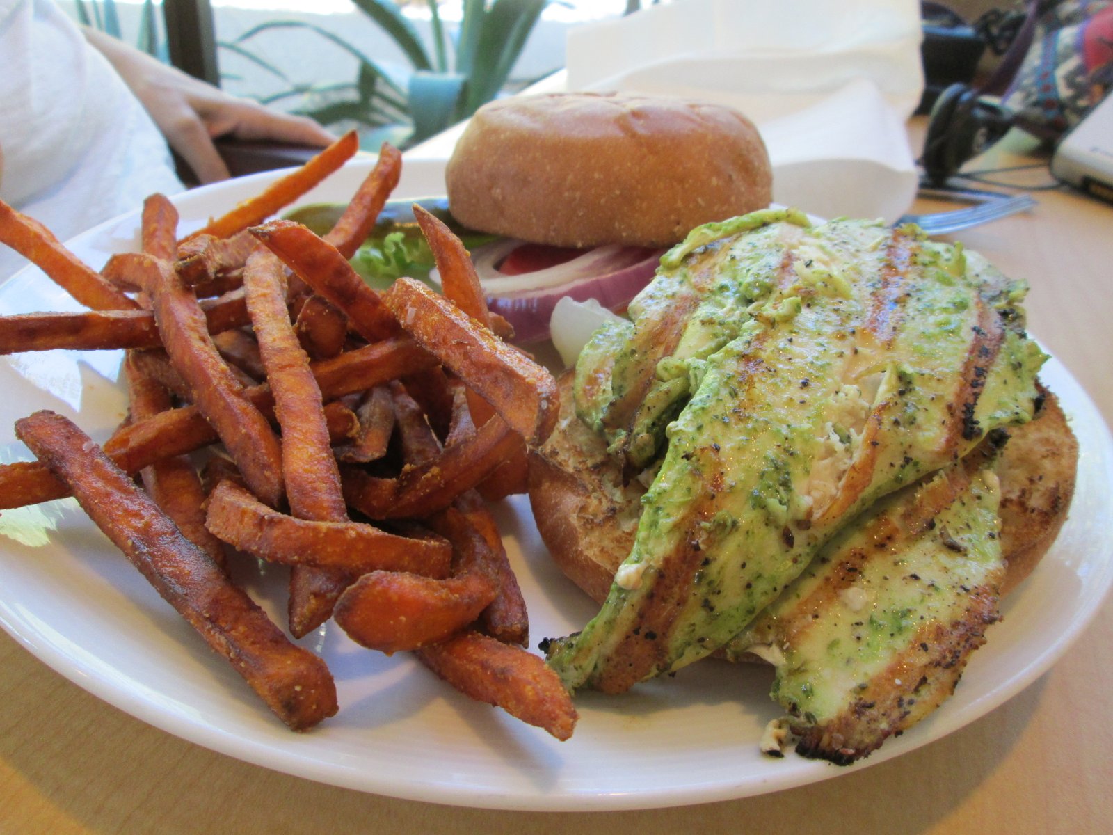 She liked the pesto sauce and the freshness of the veggies. And the lightly battered sweet potato fries were excellent, flavorful and crunchy.