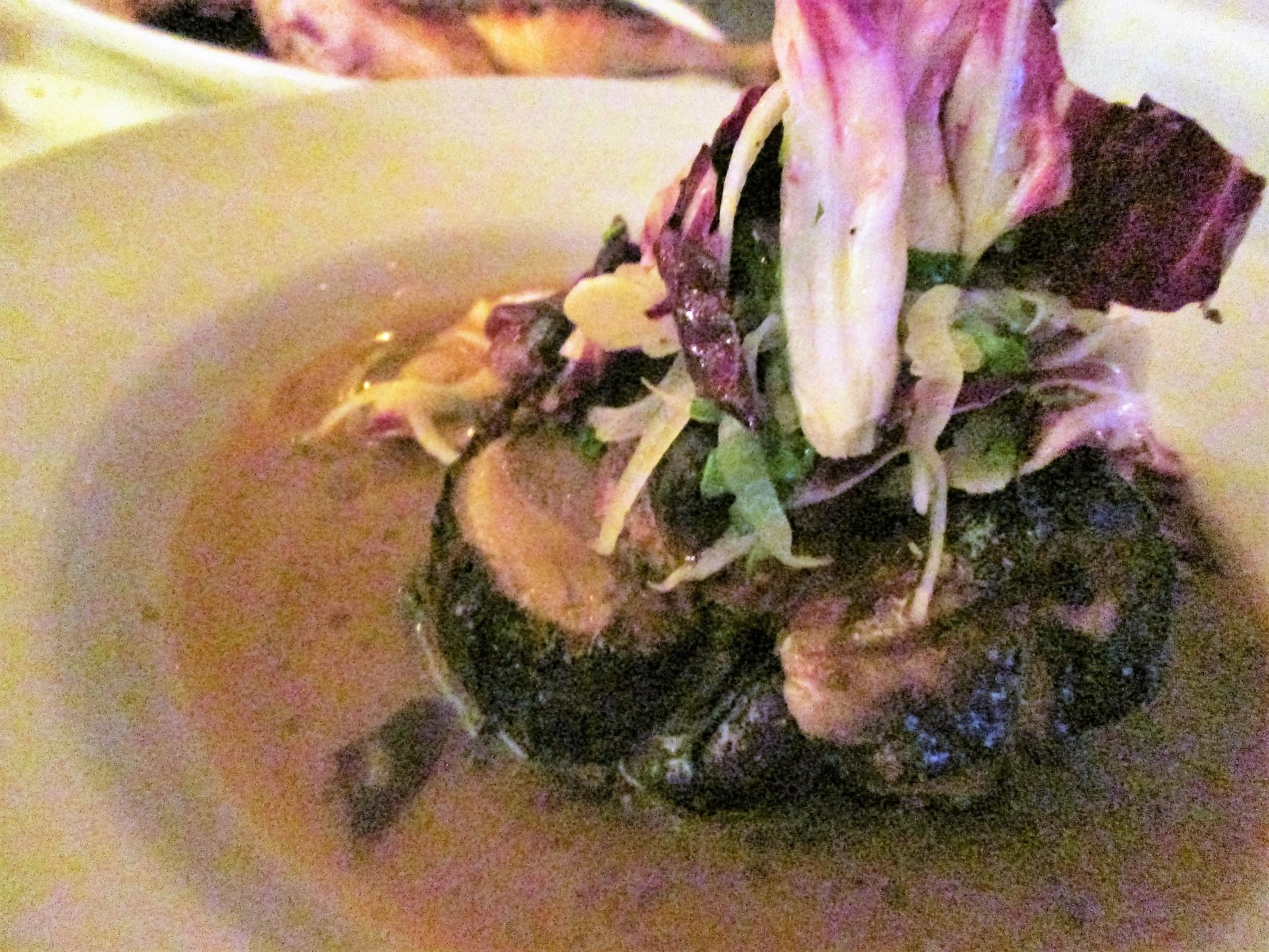 Anyway, back to the food. We started with a salad – lemon cucumber, celery root, parsley, and red onion with a pleasant mild creamy vinaigrette: