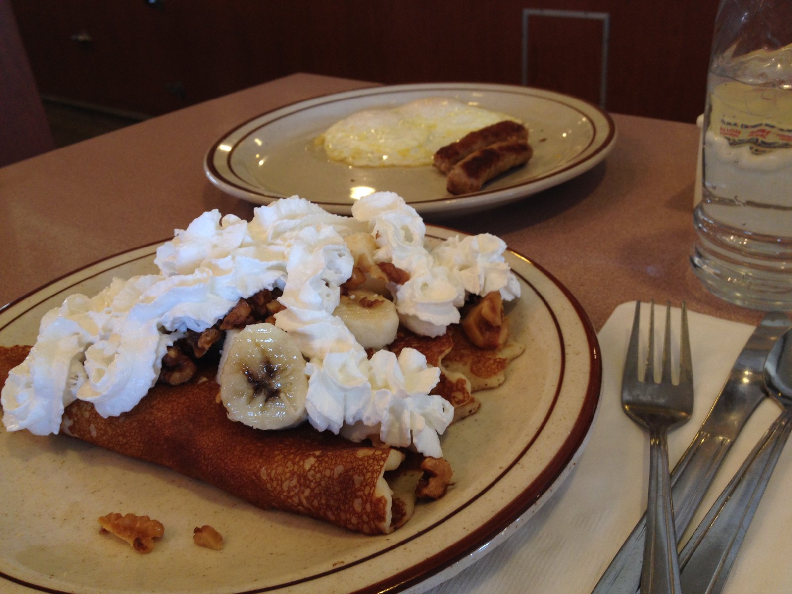 The 'pork sausage w/ fresh apples- cheese omelet' ($9.95) was most unexpected (and in keeping with my penchant for fresh apples). Yes, breakfast sausages and sautéed fresh apples filled this large eggy-cheesy breakfast omelet! There were some great home fries and toast which accompanied this surprising menu special. These banana walnut crepes which came with two eggs and sausage ($8.95) were filled with a fluffy cream cheese-cottage cheese mix and topped with toasted nuts and nicely ripe banana slices; not crazy sweet at all. These are not delicate flat crepes, but also not thick pancakes…more of a Swedish pancake.