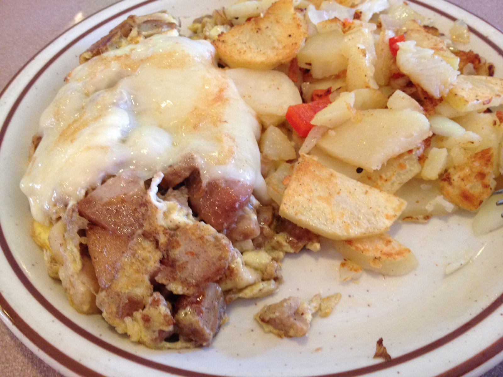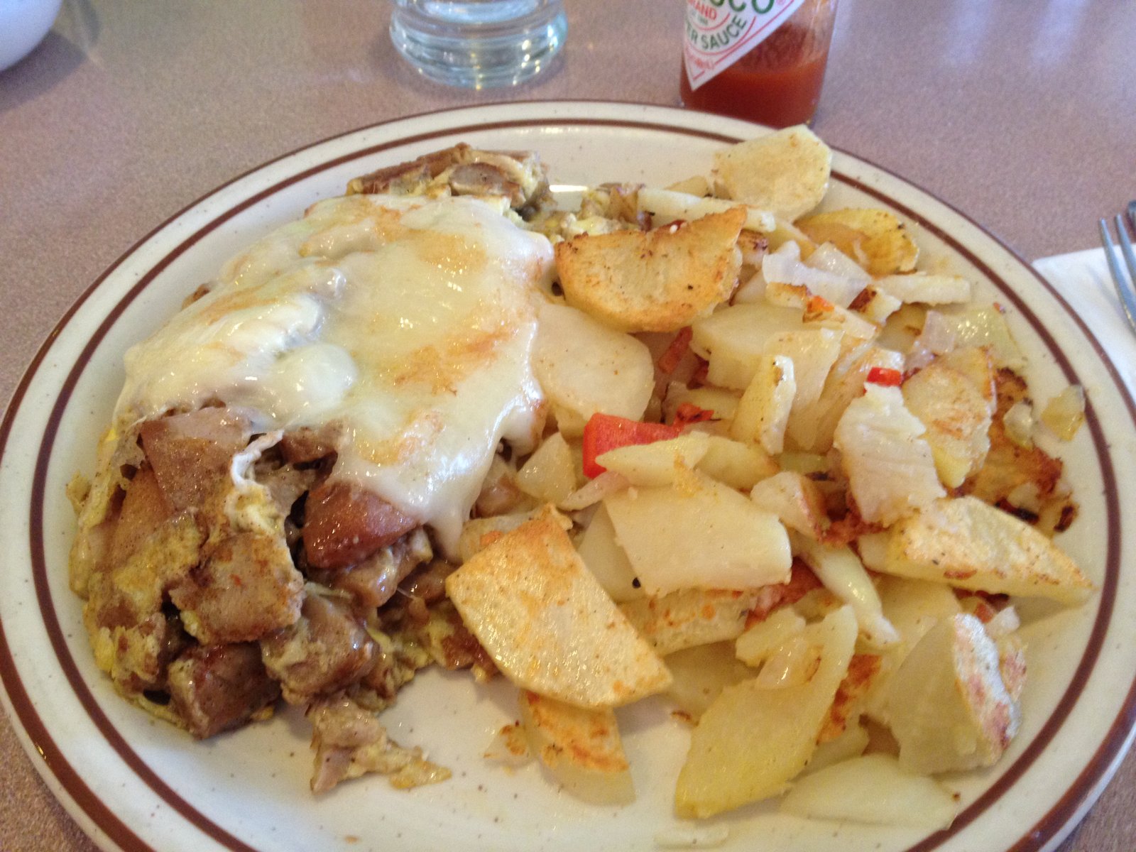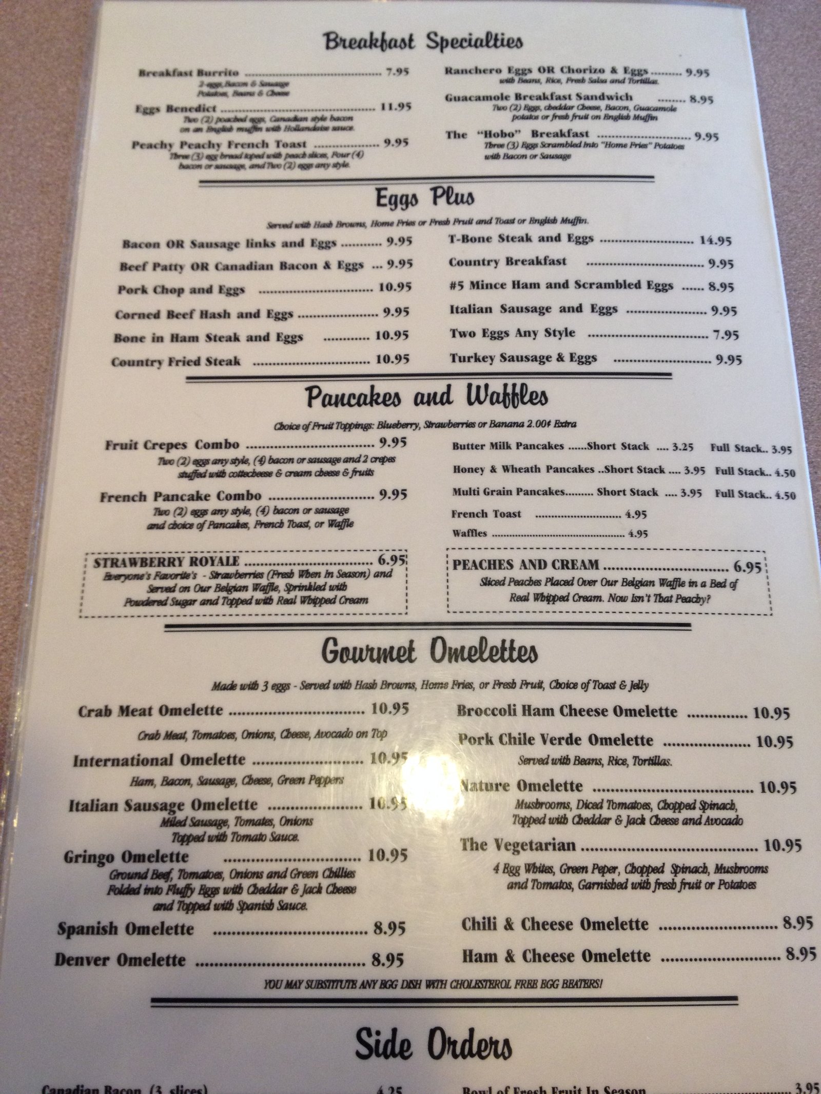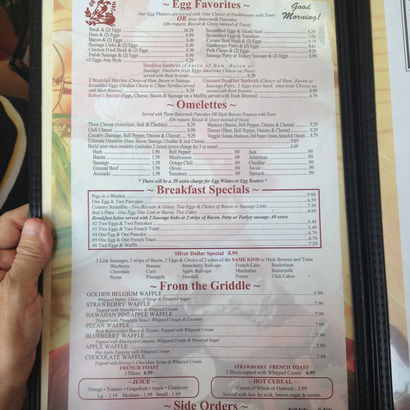 The old fashioned sign (which must look very cool at night) is a friendly welcome to the naugahyde, paneled, not recently updated interior; half of the building is a 'bar' area, open in morning hours. The breakfast menu is served all day. Let me preface this by saying that we took home a lot of leftovers.