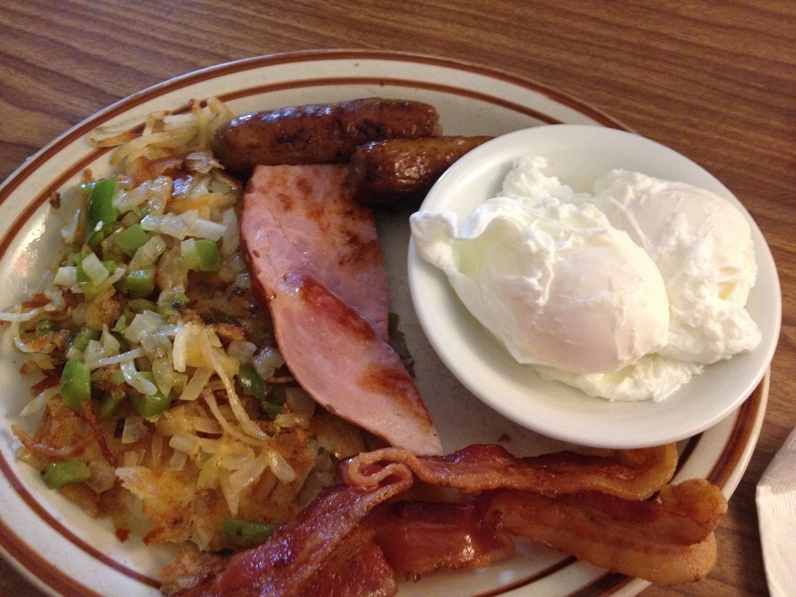 The 'Chuck Wagon Country Breakfast' ($11.95) was absolutely wonderful in quality and flavors! Three eggs (poached, of course), two (large, flavorful) link sausages, two thick pieces of smoked meaty bacon and a slice of country style ham with a side of thinly sliced, crispy home fries topped with green pepper and onions. There was also a choice of toast or pancakes with this plate.