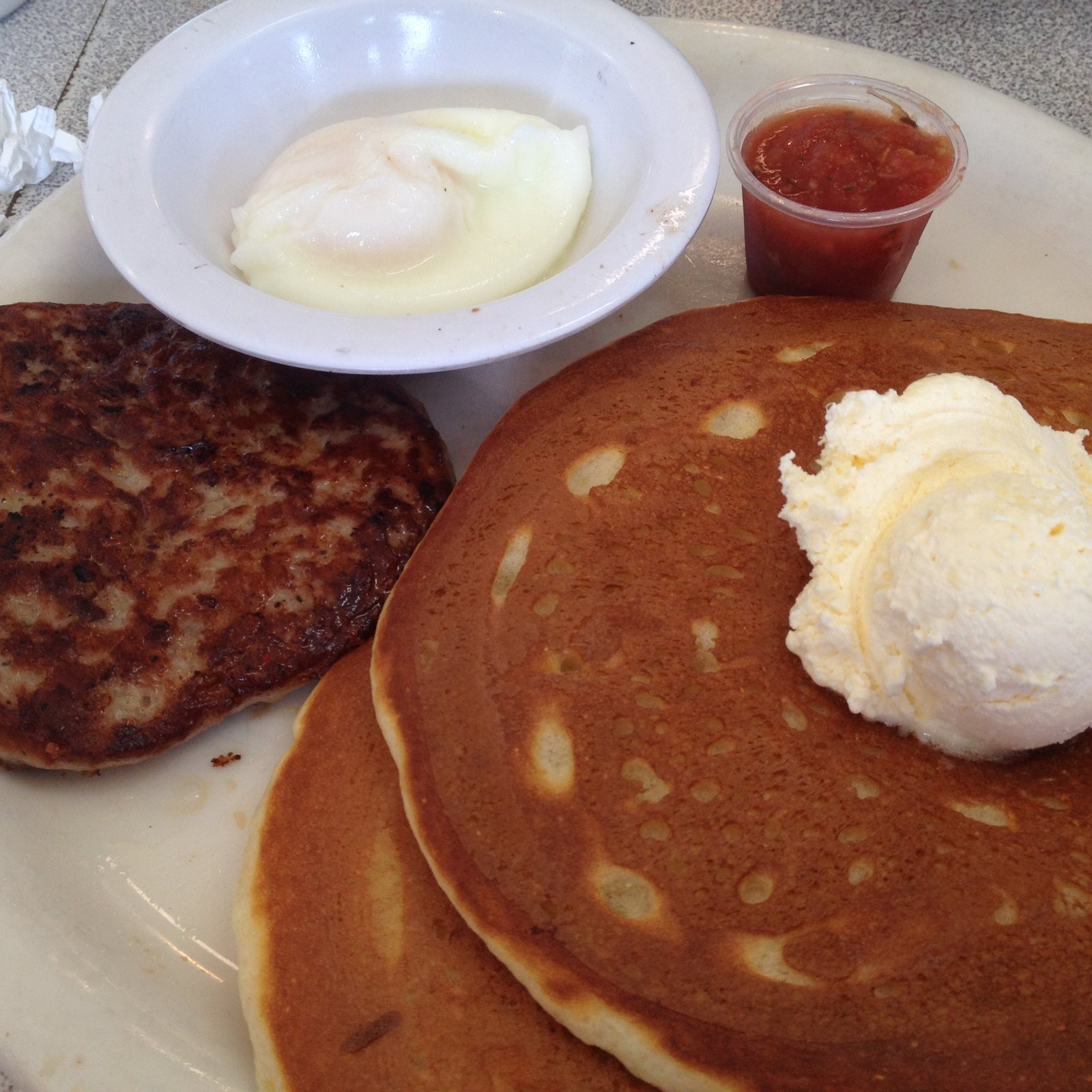 This is the two egg, two pancake deal (the second egg was brought over later)($5.49, additional .69 to substitute sausage patty for links-worth it!) was particularly good.
