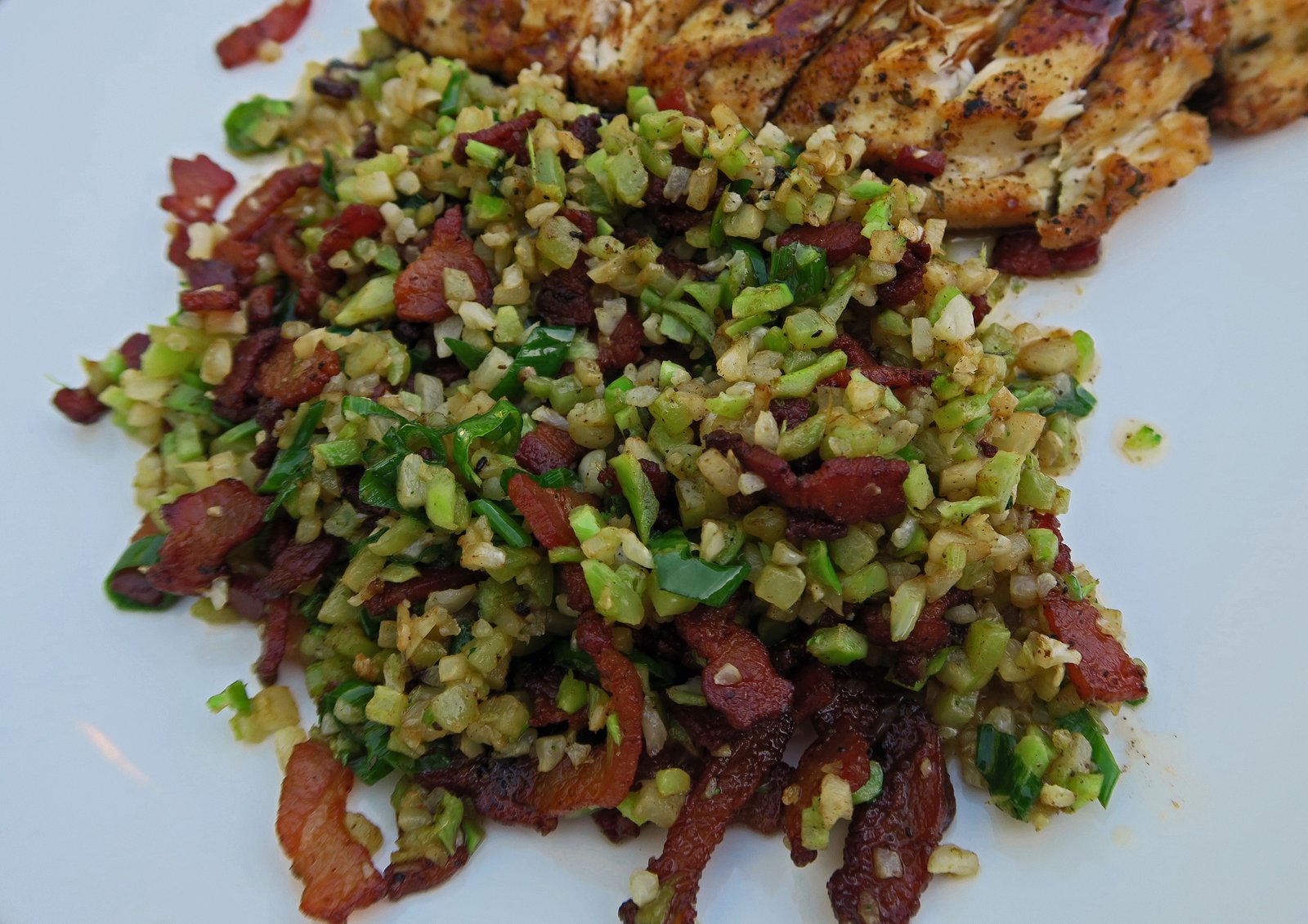 The thing that was fun was the other "stuff". Having broccoli and cauliflower on hand; I ended up ricing the veggies. I then rendered lardons of bacon using the fat to cook the riced vegetables, with some shallot, garlic, and scallions. Sort like funky fried rice.