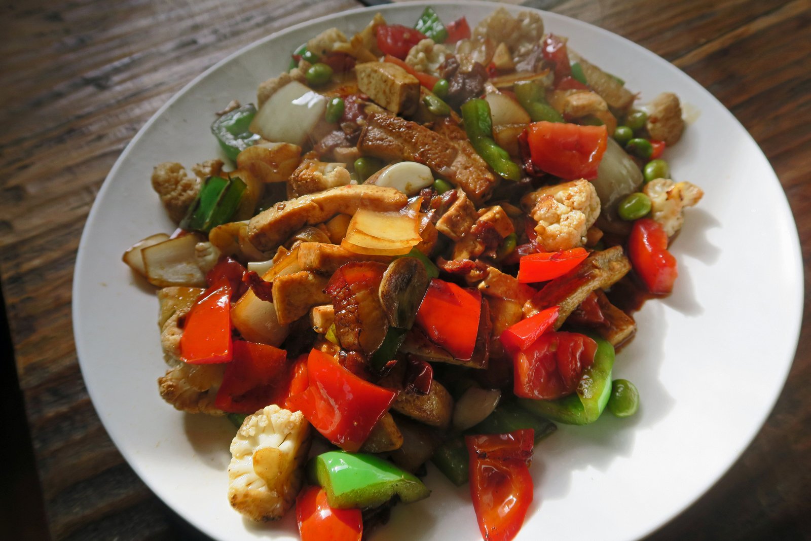 At the end of my smoke session; smoking tri-tip for the Missus's Thanksgiving potluck, I looked through the fridge and found some tofu and cauliflower, which I love smoked. I'd recently purchased some La Rou and decided to do a simple stir fry with vegetables.