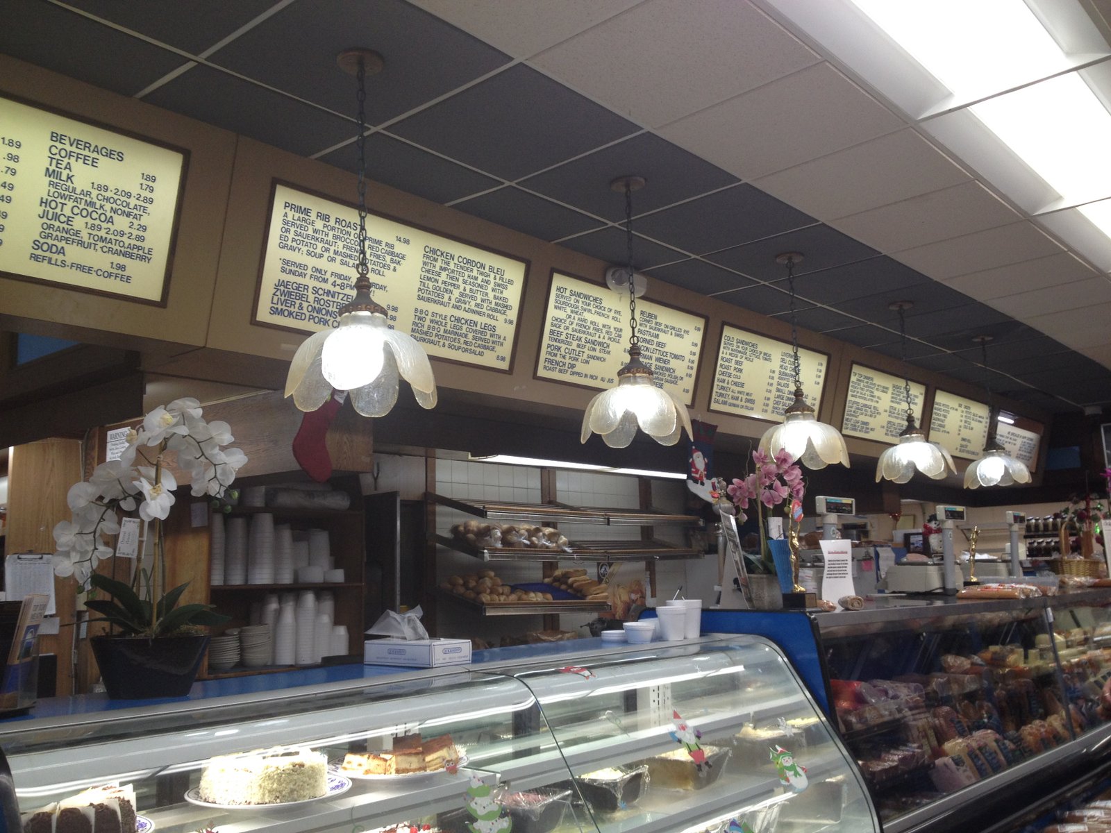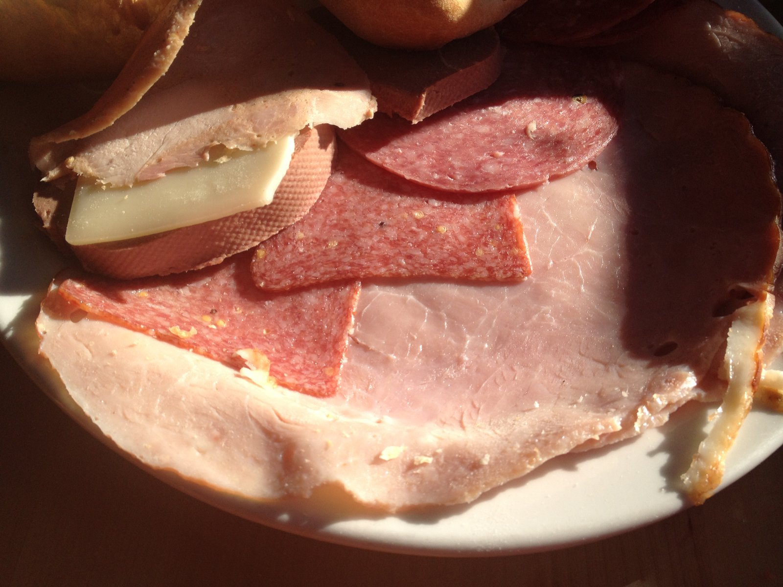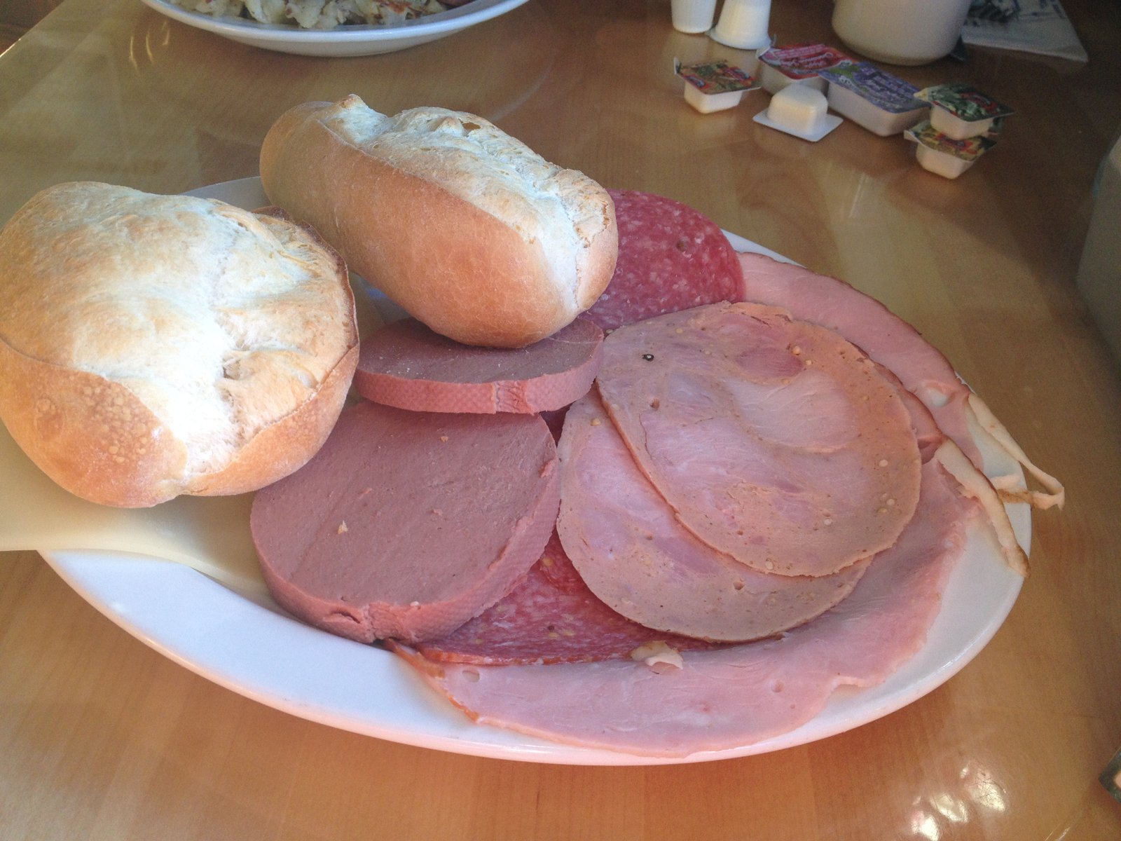 My 'Continental Breakfast' ($8.99) consisted of two thicker slices of cheese along with two quite large, crusty fresh fluffy rolls and two slices each of liverwurst, an in-store deli meat made in aspic with ham, mustard seeds and peppercorns (it's not head cheese, but a milder flavored, pleasant deli meat), two types of salamis and two thin slices of a wonderful Black Forest ham. This was a perfect breakfast for me.