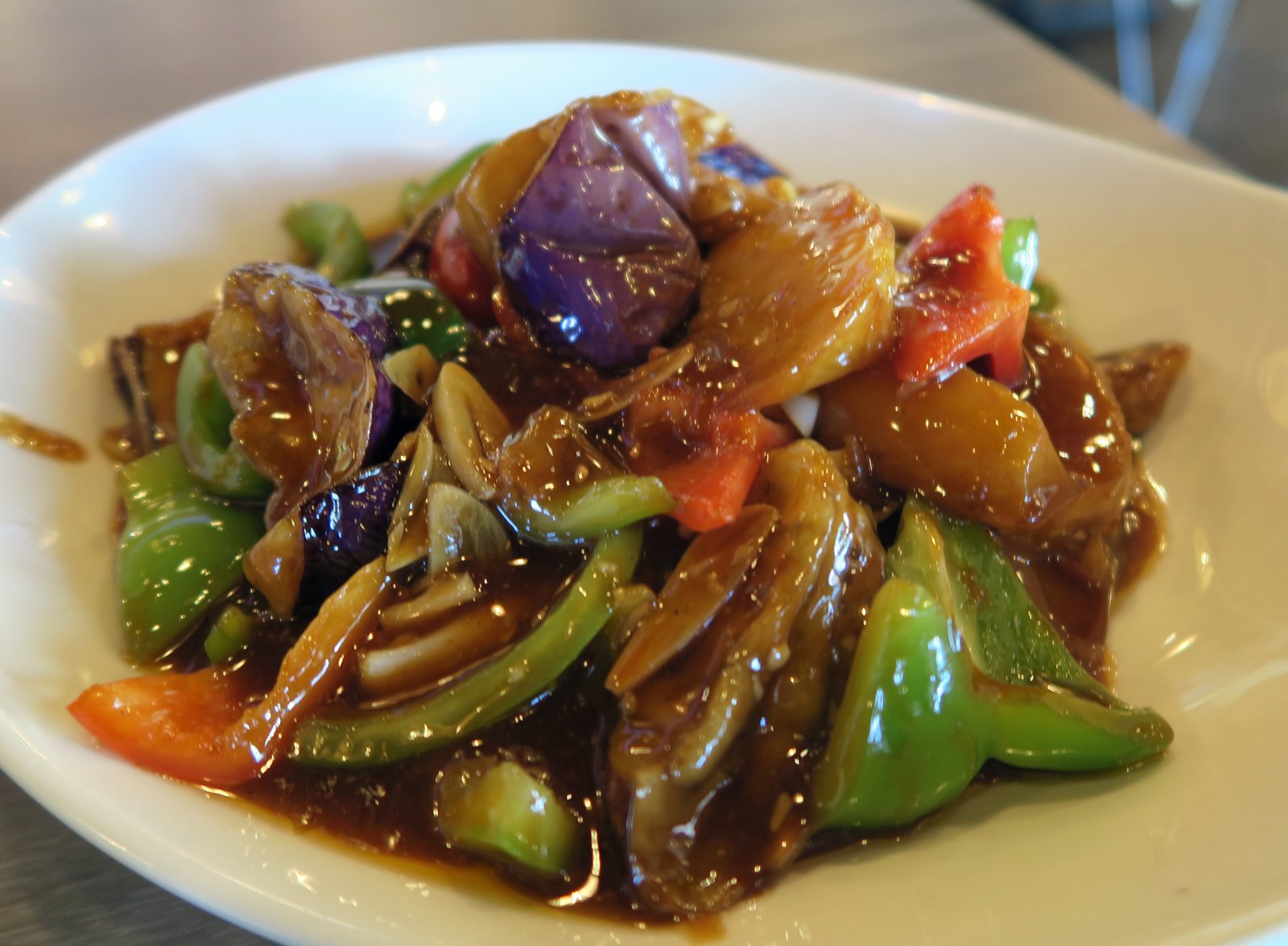 The classic stir fry of potato, eggplant, and bell peppers. This was actually properly prepared; you basically need to deep fry the potato and eggplant before adding the sauce for thickening. This version kept too much of the cooking oil and the seasoning fell a bit short, I'm used to having it a bit sweeter. This version also seemed to have black vinegar in it, which I kind of enjoyed.