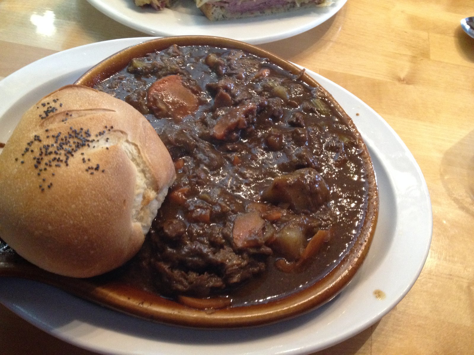 IMG_6931 IMG_8567  Kirk had called his meals at Sam Woo BBQ 'early lunch'.  The menu lists these under 'breakfast' ($4.25 each).  I almost always order the fish porridge, but another choice is the shrimp dumpling noodle soup.  Each is good and satisfying. Sam Woo BBQ  7330 Clairemont Mesa Blvd Ste 103 San Diego, CA 92111 IMG_6958 An Item I haven't mentioned that is served at Tip Top Meats is the Beef Stew ($6.98). Made daily from scratch, limited in quantity, this rich, meaty, traditional stew is great.  Tip Top Meats and European Delicatessen 6118 Paseo Del Norte Carlsbad, CA 92009 Website