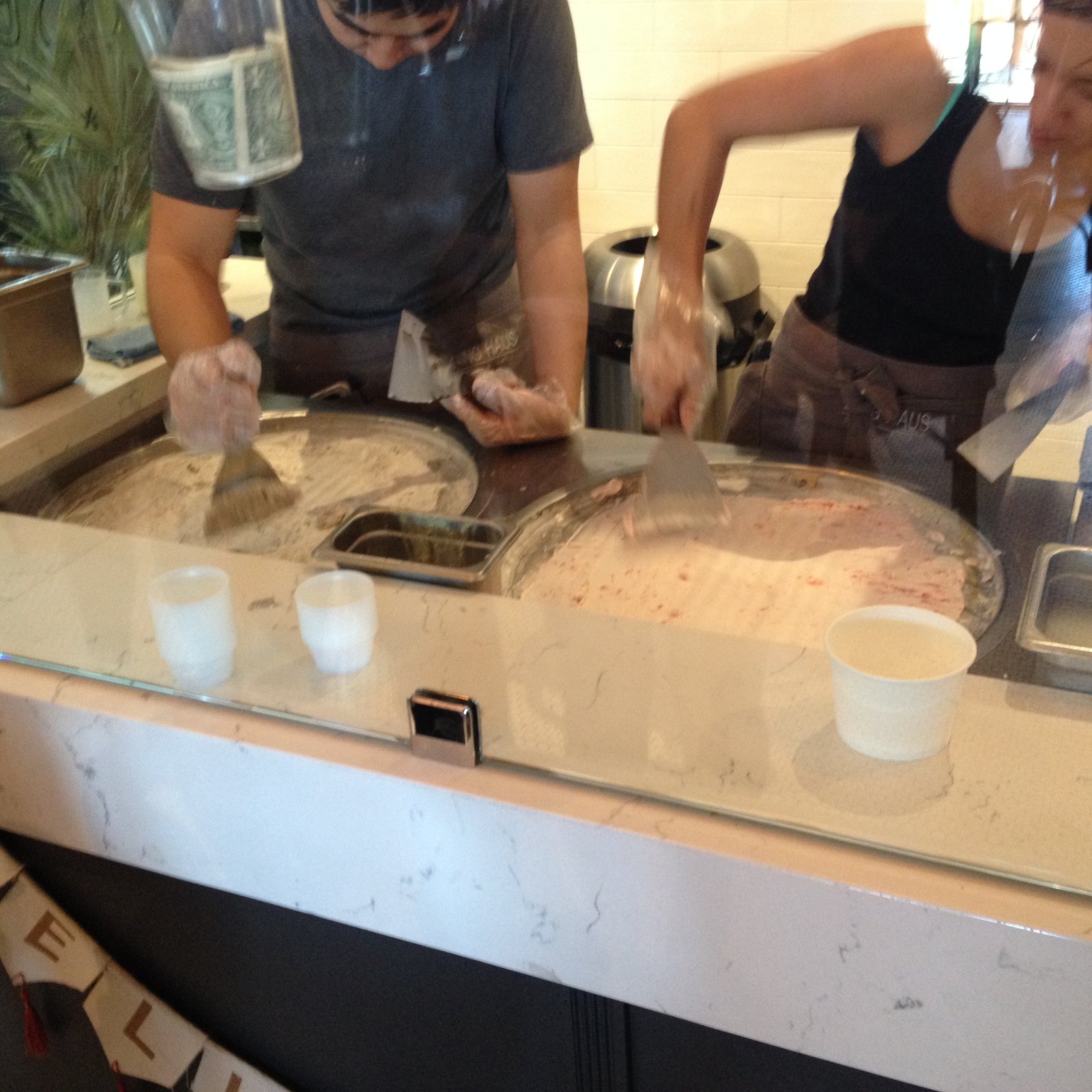Those are 'anti-griddles'- steel surfaced flash freezers. Order a 'rolled ice cream' ($6.25) and a measured cup of heavy cream is then poured onto the surface where it begins to solidify after being evenly dispersed. The cream may then have an ingredient mixed/chopped in and then the thin, frozen layer is scraped into rolls, placed into your cup and topped.