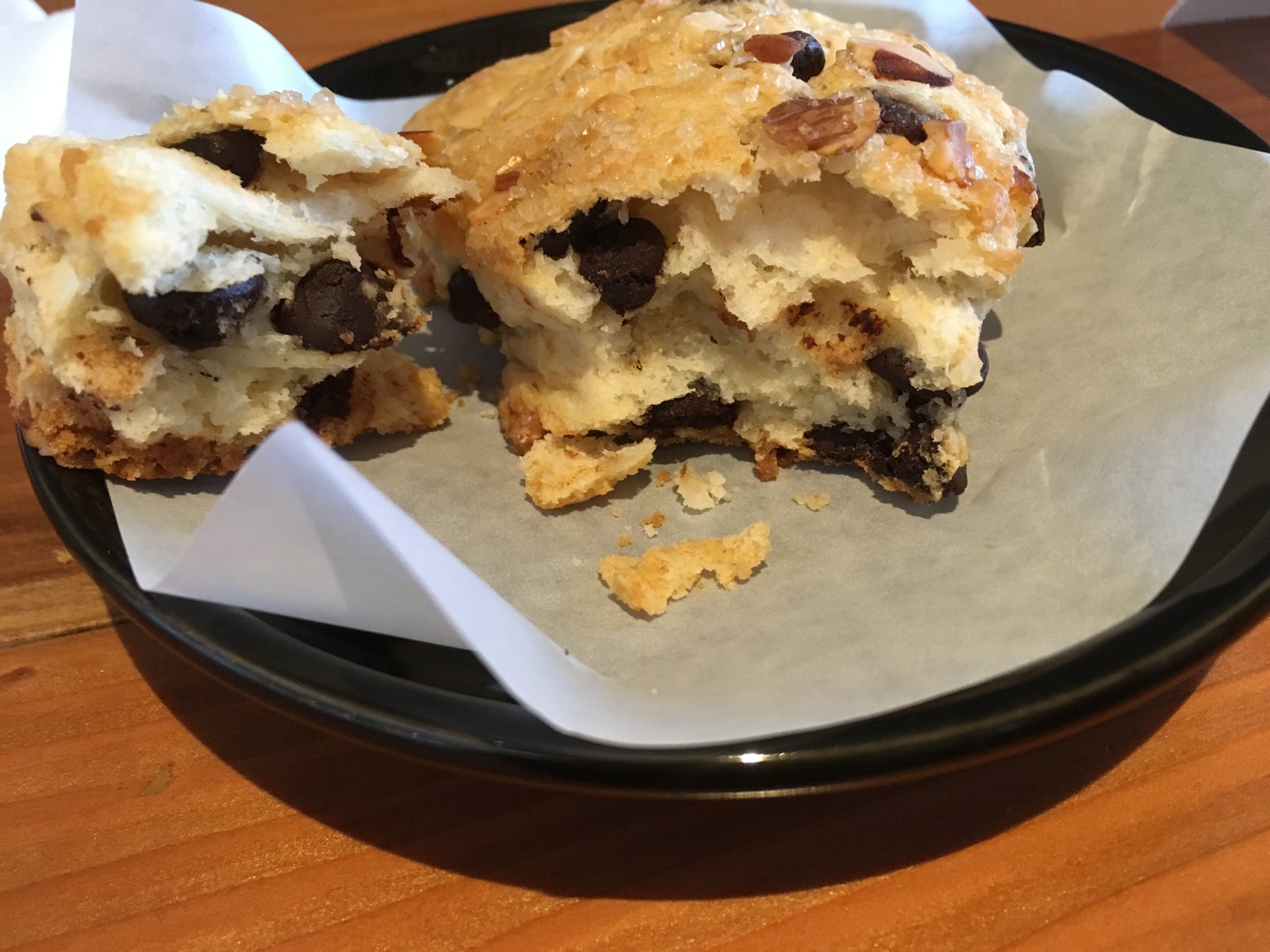 That pastry case sometimes has 'day old' items for $1. Based on past experience, I know that day old scones age well. This one had chocolate chips and coconut as well as almond slices and was delightfully flaky and light. It went well with a fresh cup of coffee.