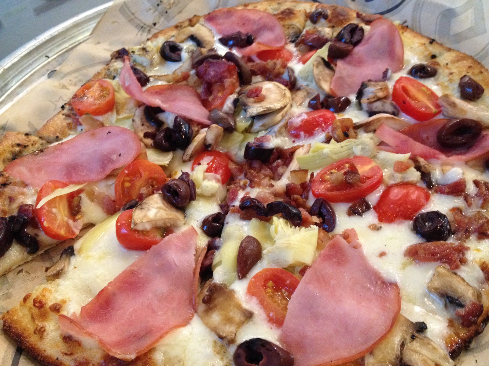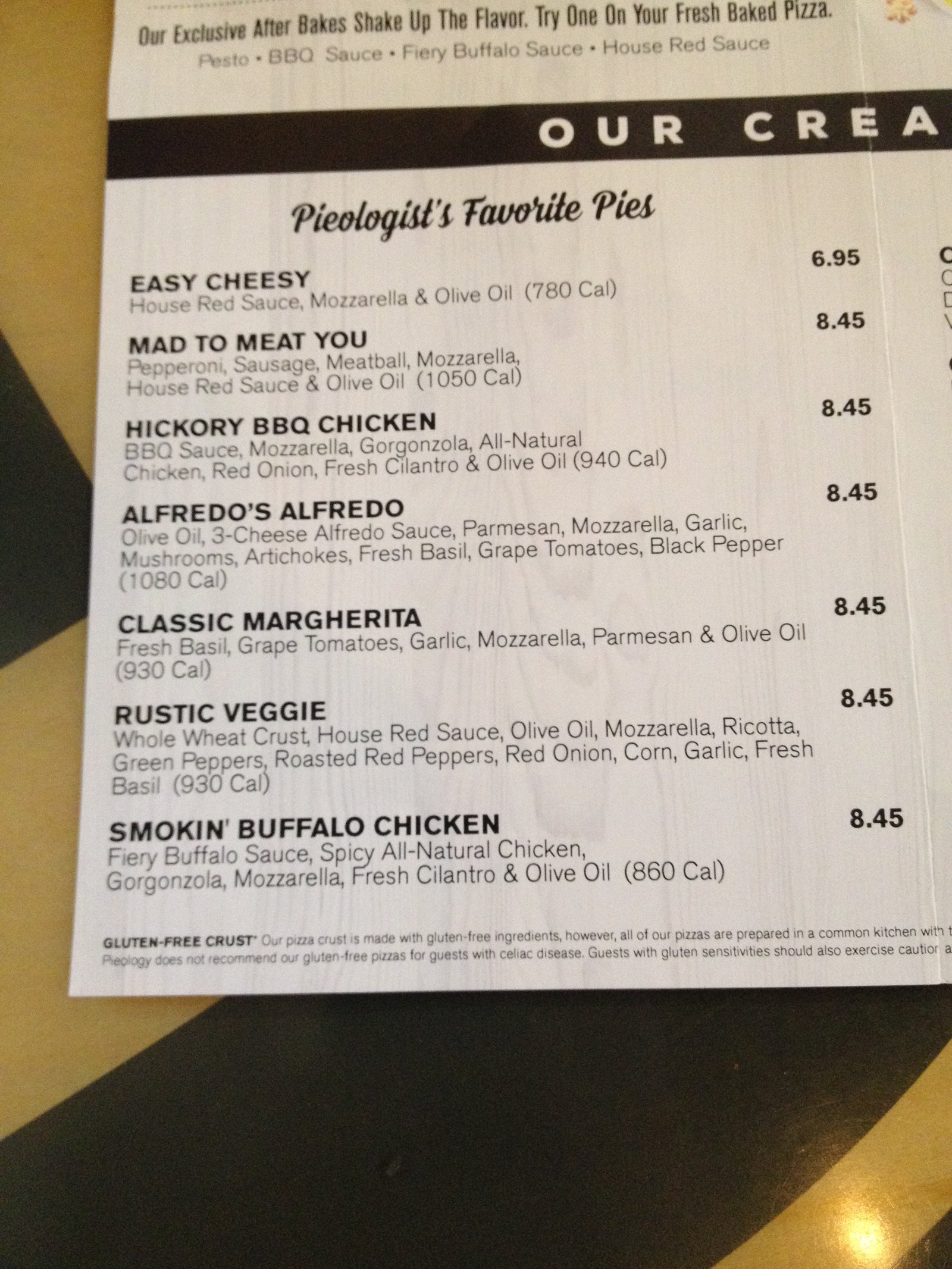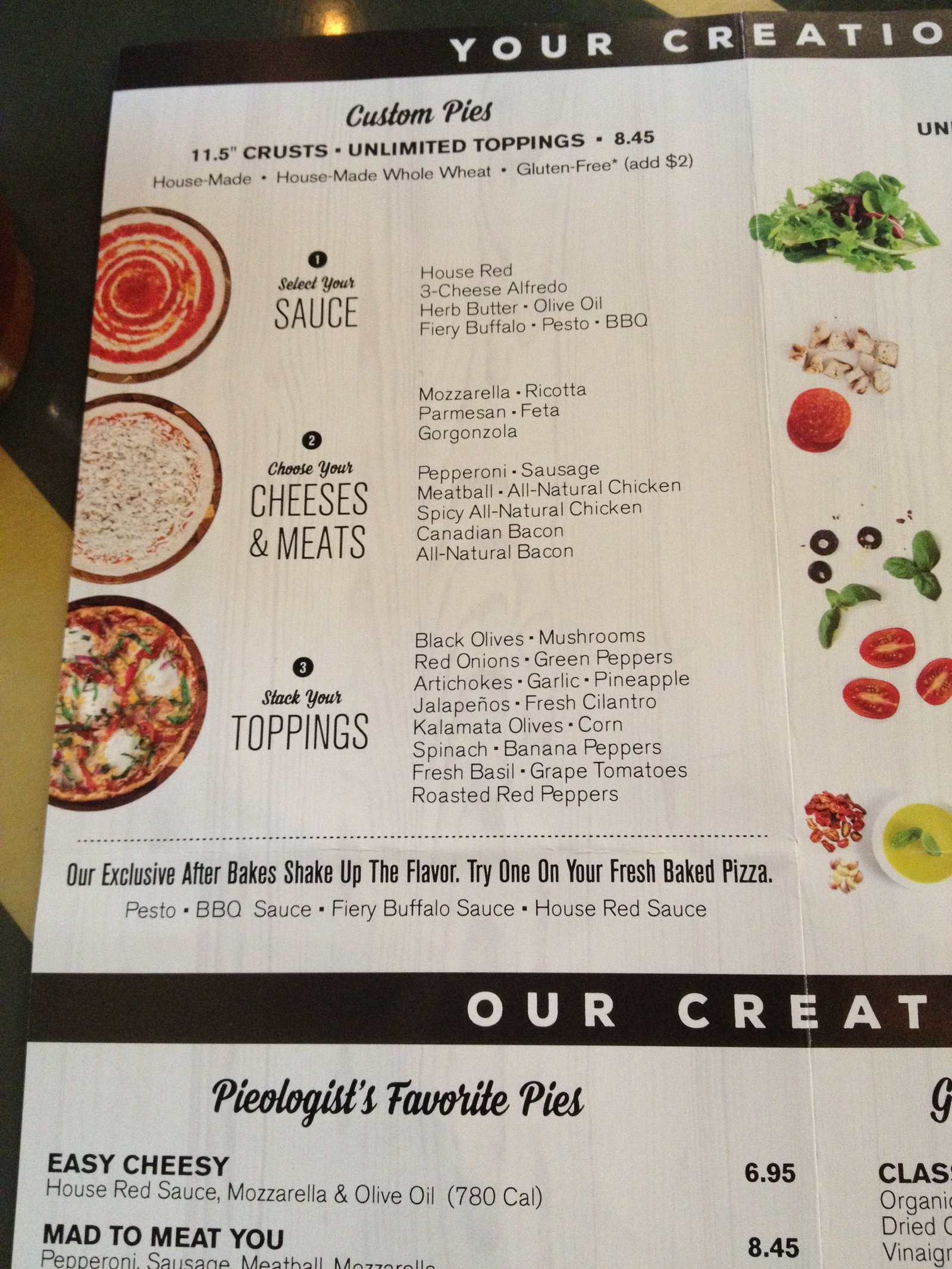 One of the 'Pieologists Favorite Pies' available is 'Alfredo's Alfredo' (this creation of preselected ingredients also shows the highest calorie count of 1080) Olive oil, three cheese alfredo sauce, parmesan, mozzarella, garlic, mushrooms, artichokes, fresh basil, grape tomatoes (then we added on bacon and olives, because at that point it didn't matter). This pie was excellent, rich and flavorful and enough for two to share.
