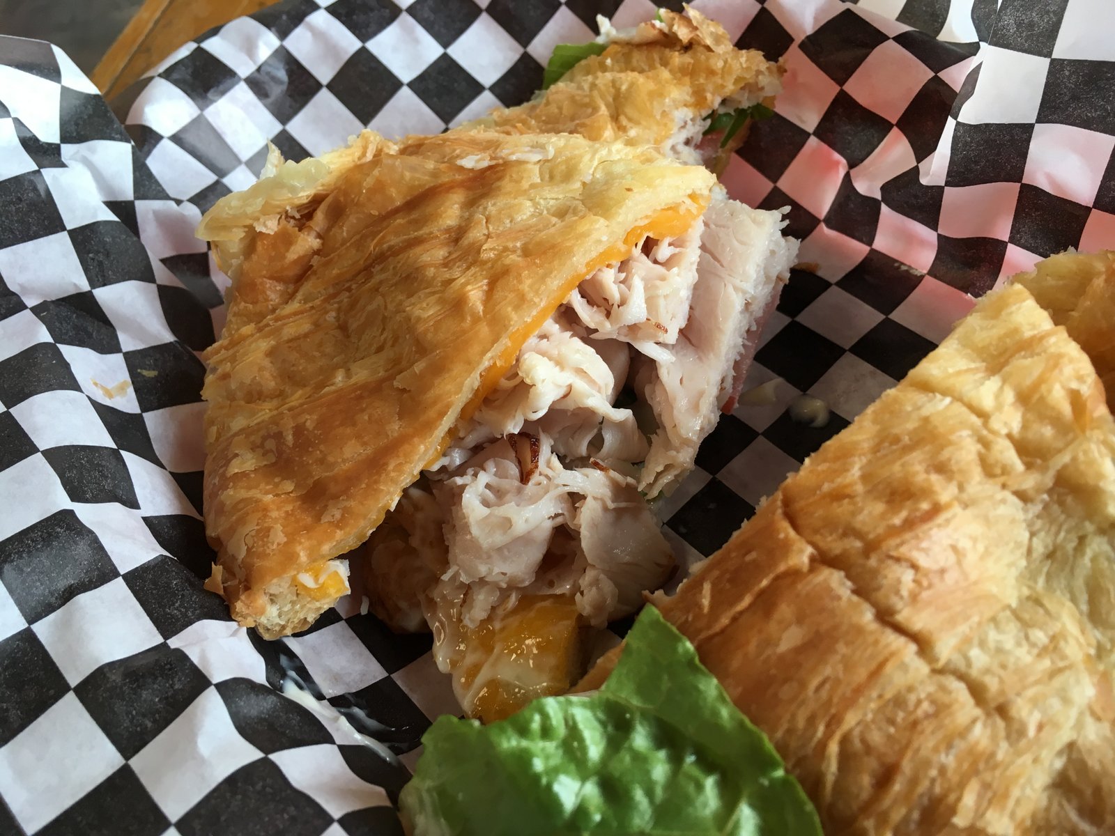 The sandwiches are $6.99 and this turkey with cheddar choice was really good; a good amount of high quality thinly shaved quite flavorful turkey. Standard toppings of lettuce, tomato, mayo, no onion. It was served on a fresh, toasted croissant, probably from Costco. I like basic, good quality sandwiches.
