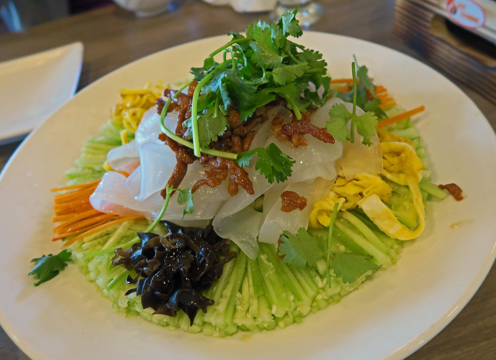 Again very nice prep; everything from the thinly sliced vegetables to the pork and egg was seasoned separately. The dressing; a sesame paste black vinegar concoction; with a touch of wasabi tasted like a lighter version of what I make at home; though without as much sesame paste. It's a nice combination of nutty-sour-sweet. Pretty good overall; this will go well during hotter weather.