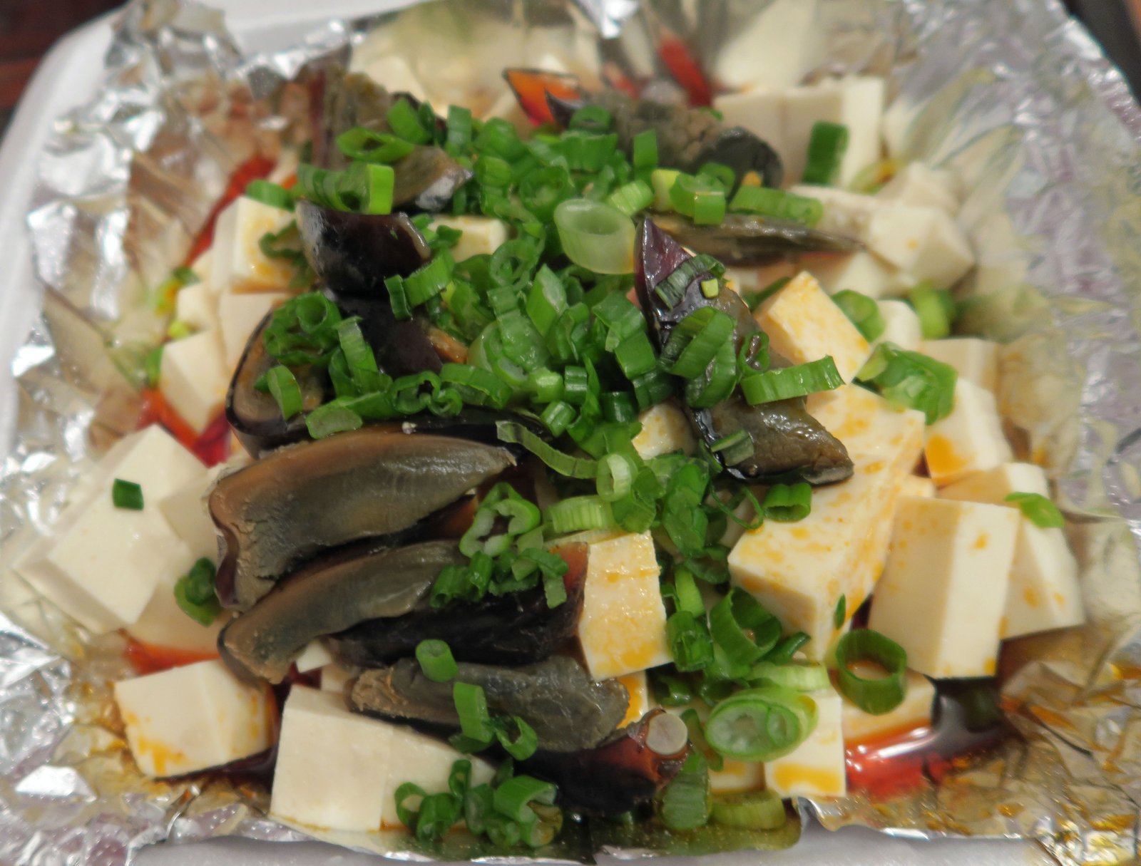 The portion size was well worth the $4.99…….until I opened my big fat mouth and said that we could do better just making this ourselves. Sigh. So now it's organic tofu, preserved egg, scallions from the yard, and Sichuan Peppercorn Oil at home.