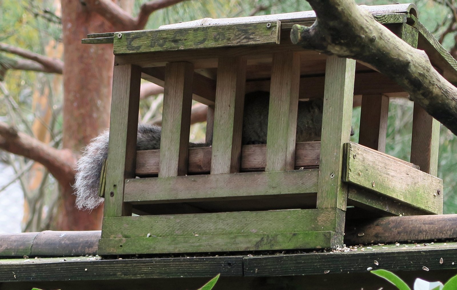 Along one of the walls were little "squirrel houses". There actually were squirrels scampering from house to house to grab a bite.