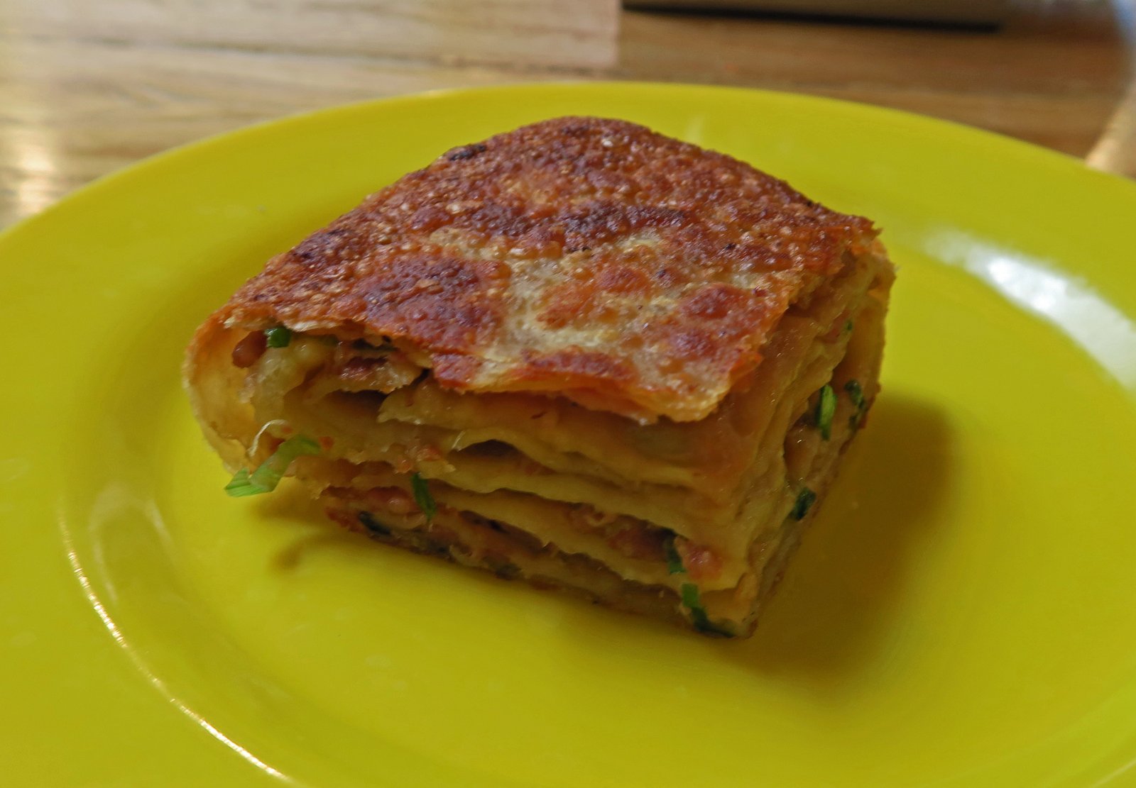 Man, when had I last seen this in San Diego? Seven Layer Meat Cake. Basically layers of thin scallion bread with a light sprinkling of seasoned, ground meat between the layers. The flavors were pretty good, on the rich side. Enjoyed the crispness, but this looked a bit over-cooked and was the exterior was on the hard side instead of crisp. Nice try though.