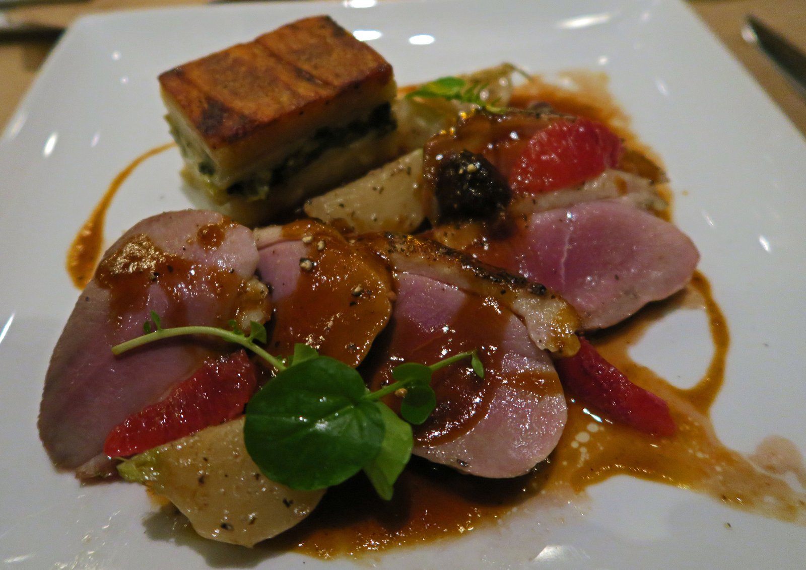 There were some nice elements to this dish; the Swiss Chard Gratin was so good; rich, slightly buttery potatoes, but balanced by the light bitter-sweet flavor of the chard. The duck had been lightly smoked and the texture was outstanding; it was still tender and hadn't firmed up too much. Served medium was perfect for this. My only problem was that the sauce was way too salty. I gave up after a few bites and the Missus traded dishes with me. She plowed through this like there was no tomorrow.