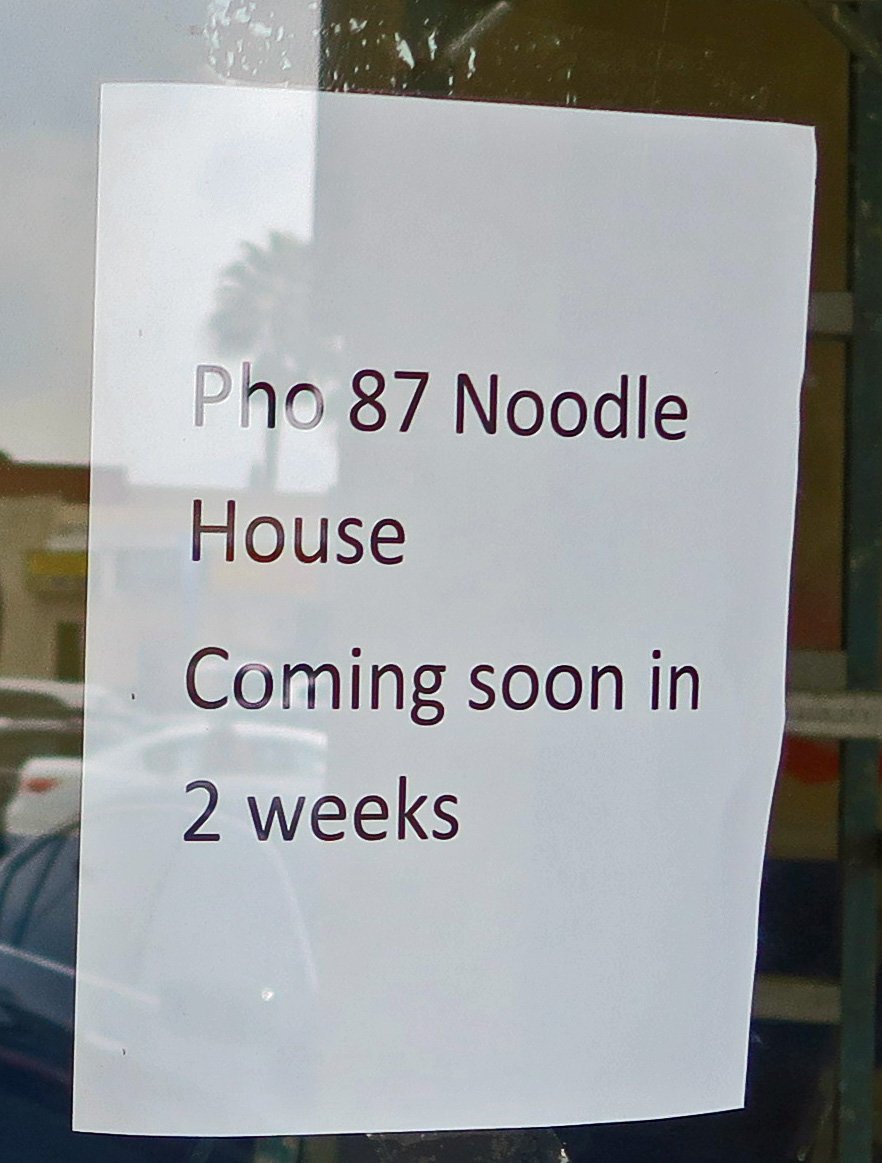 And found that the place was being renovated. The sign on the door said "Pho 87 Noodle House. Coming soon in 2 weeks."