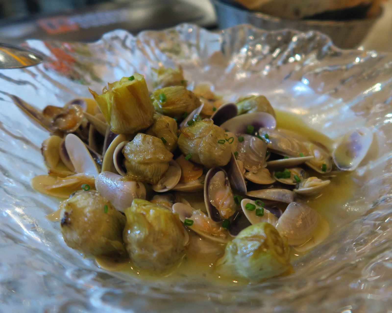 We started with a media racione (half portion) of Coquinas a species of Donax (small clams) served with fried baby artichokes.