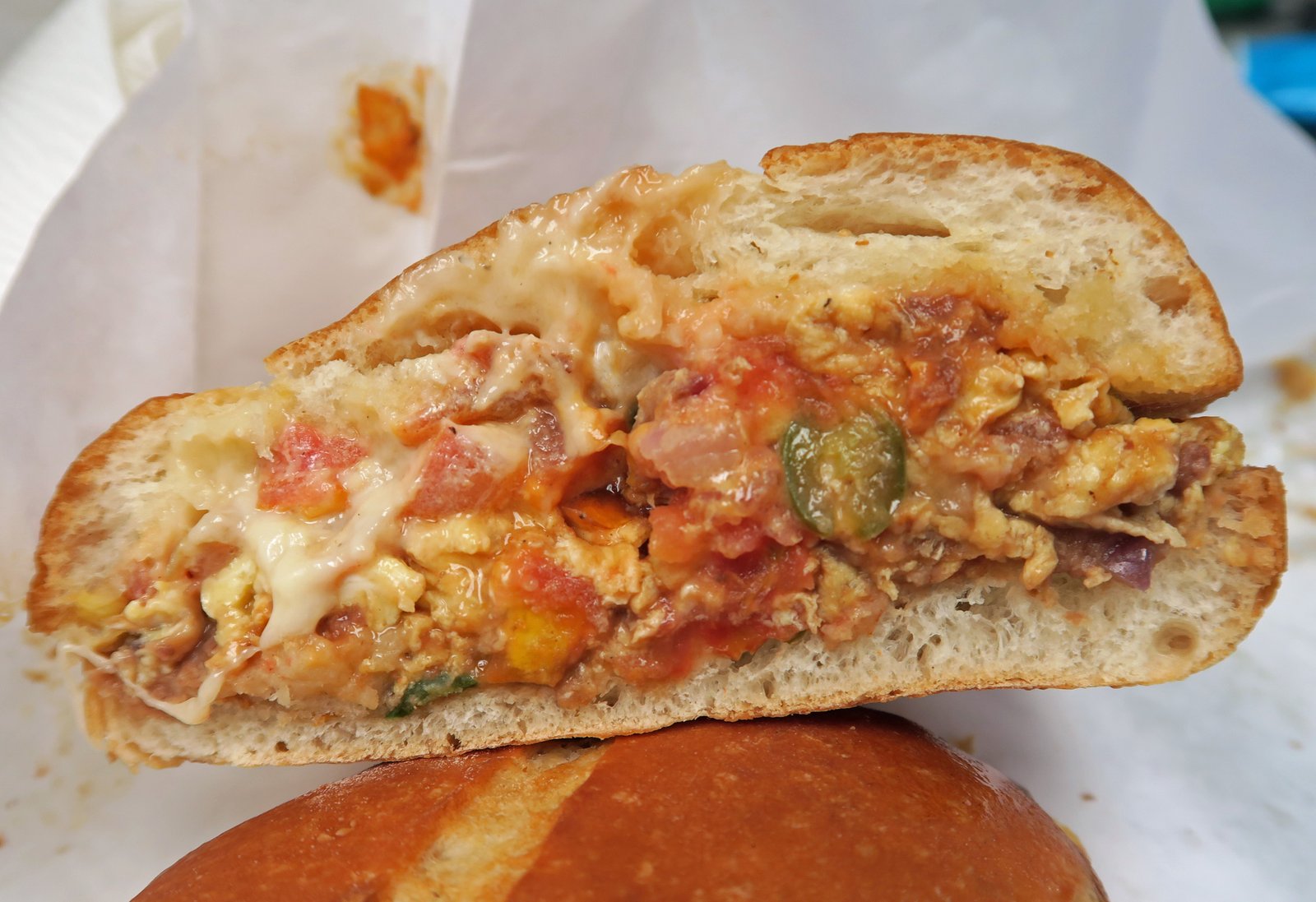 A nice, rather light bolillo roll; eggs, salsa, a smear of beans….some jalapenos for a mild kick, melted cheese. Warm and not too filling….I don't want to need a nap when I've just gotten into the office.