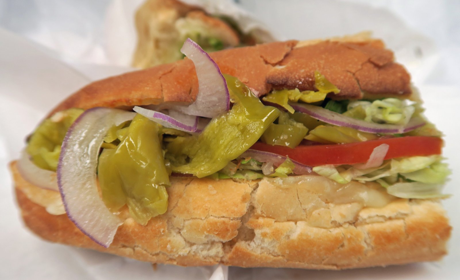 Crusty bread, a healthy dose of pepperocinis, onions, tomatoes, perhaps a bit too much shredded lettuce, and nicely melted, milky and salty feta. Still, it the bread that makes this machine go.