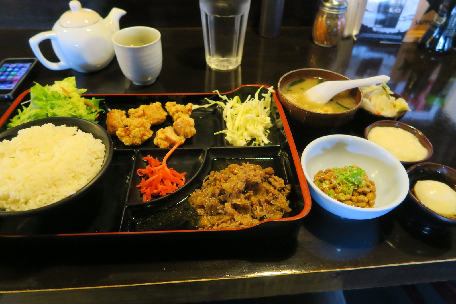 Anyway, it basically is all about the natto and rice thing….though I got beef and chicken karaage. The beef was tender and there were no complaints. The karaage was fine; crisp and nicely flavored…..but in a real amateur move, they had cut one of the pieces in half to check doneness.
